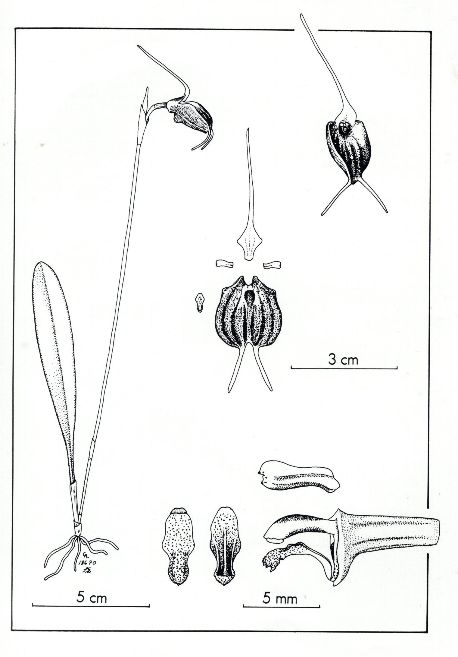 Found in central Peru at elevations around 1800 to 2000 meters as a miniature sized, cool growing epiphyte with slender, erect ramicauls enveloped basally by 2 to 3 tubular sheaths and carrying a single, apical, elliptic-oblong, subacute to obtuse, gradually narrows below into a cuneate, indistinct petiole that blooms on a erect, slender, triquetrous, successively single flowered, congested, racemose inflorescence arising from the base of the ramicaul with a bract above the base and imbricating, acute floral bracts and holding the flowers well above the leaves.