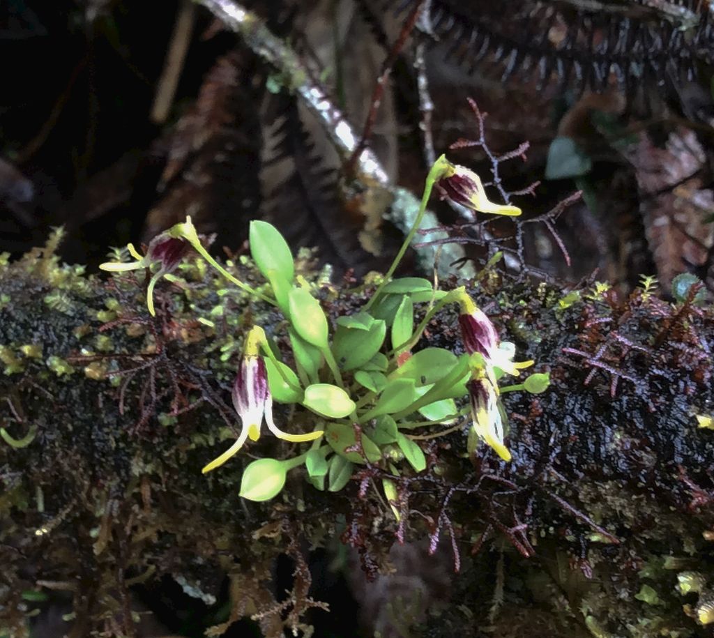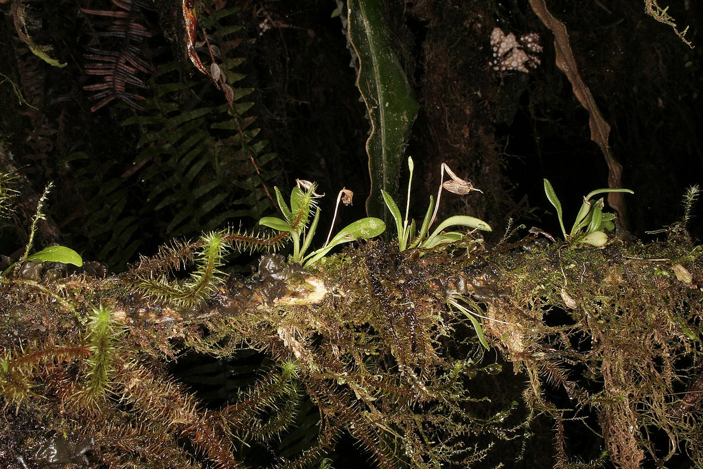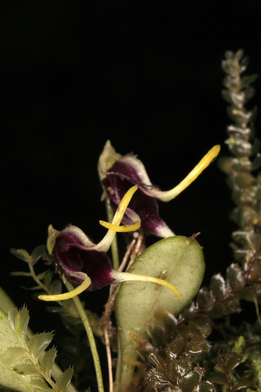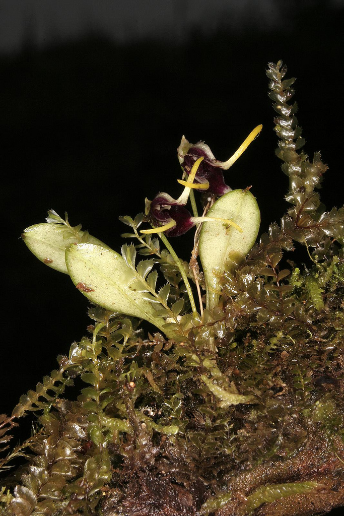 Found in Bolivia, Peru, Ecuador and Colombia at elevations of 1600 to 3400 meters as a mini-miniature sized, cool to cold growing epiphyte in damp forests on western slopes and cloud forests with erect, abbreviated ramicauls enveloped basally by 2 to 3 tubular sheaths and carrying a single, apical, erect, coriaceous, narrowly elliptical, subacute leaf that gradually narrows into the petiole below and blooms in the summer and early fall on a slender, erect, 3/4" [2 cm] long, single flowered inflorescence arising from low on the ramicaul with a thin bract above the base and a cuculate floral bract all carrying a single nodding flower