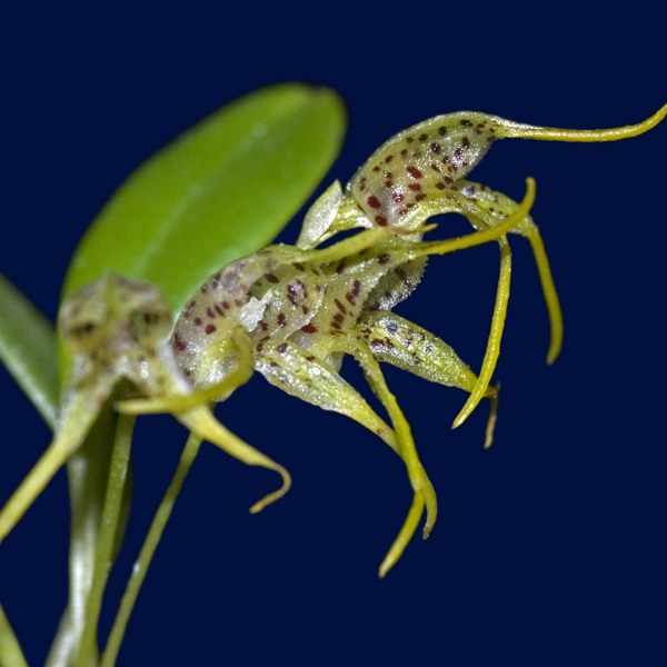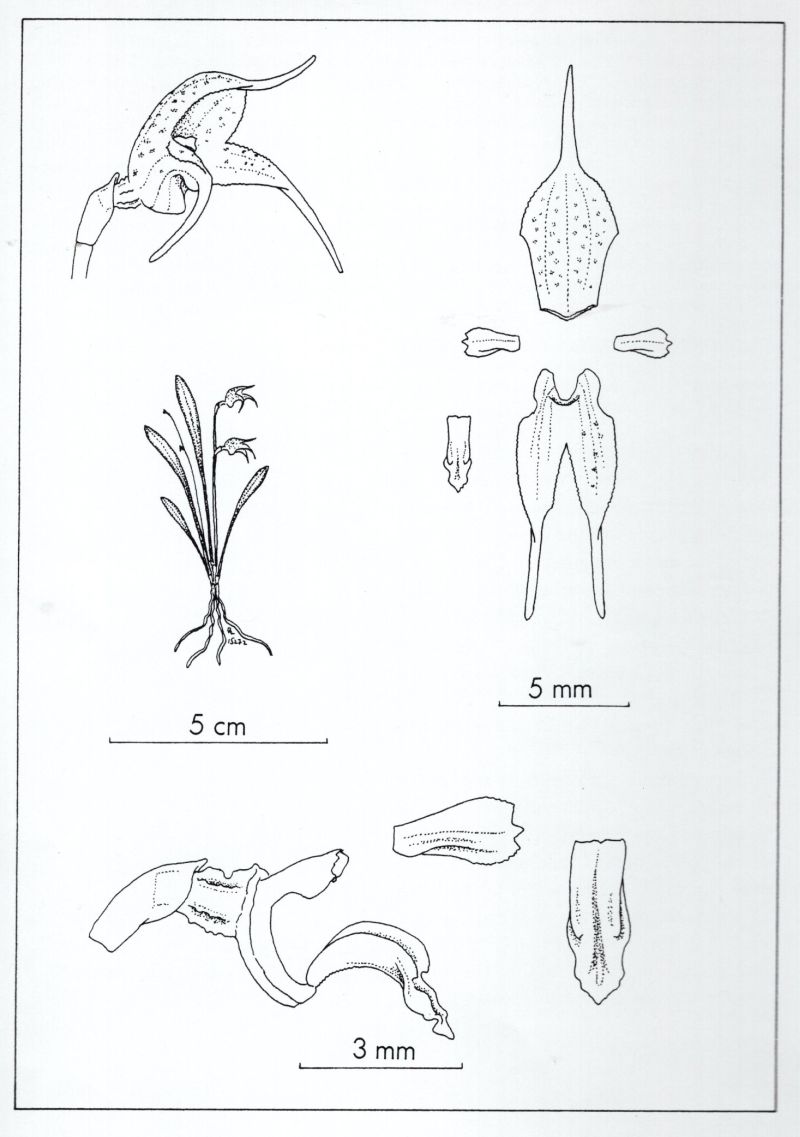 Found in northern Ecuador in moist forests at elevations around 2000 meters as a mini-miniature sized, cool to cold growing epiphyte with erect, slender ramicauls enveloped by 2 to 3, thin, tubular sheaths and carrying a single, apical, erect, thinly coriaceous, narrowly elliptical, subacute, gradually narrowing below into the long petiolate base leaf that blooms in the winter on a slender, erect, .8 to 1" [2 to 2.5 cm] long, simultaneously 2 flowered inflorescence arising from low on the ramicaul with a bract above the base.