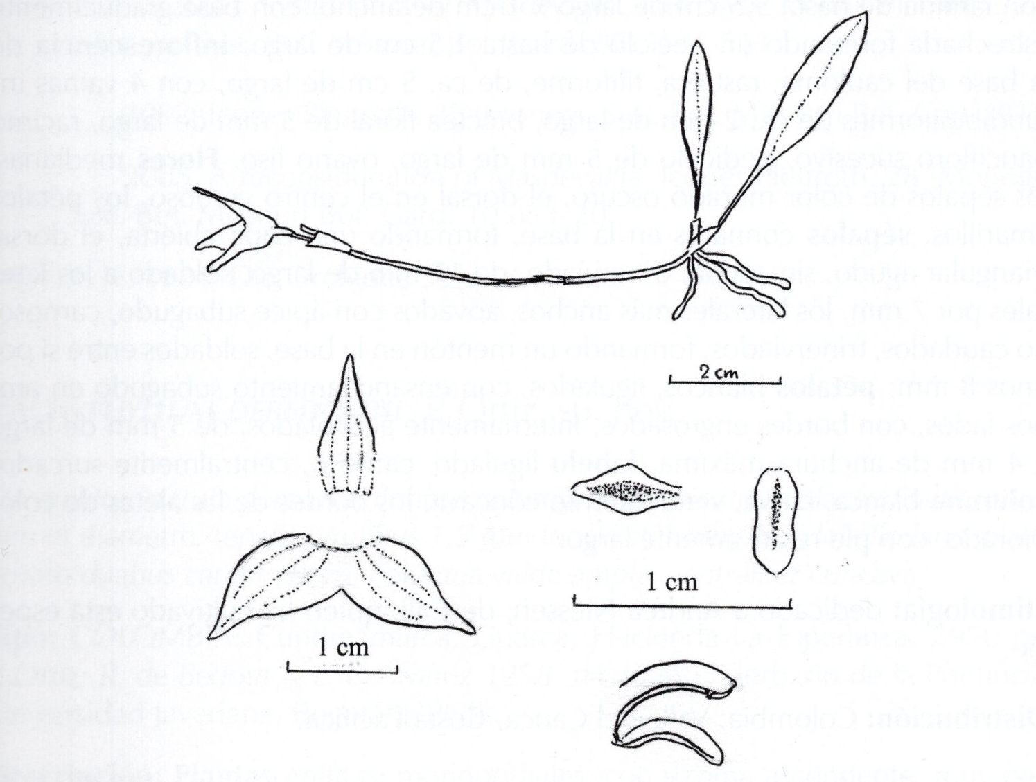 Found in Valle de Cauca department of Colombia in moist forests at elevations around 400 to 500 meters as a mini-miniature sized, hot growing epiphyte with erect, filiform, glabrous ramicauls enveloped by 2 to 3, thin, tubular sheaths and carrying a single, apical, erect, coriaceous, clear dark green, oblong-elliptical, subacute, gradually narrowing below into the long petiolate base leaf that blooms in the fall on a filiform, horizontal, 3" [ 7.5 cm] long, successively single, few flowered inflorescence arising from low on the ramicaul with 4 infundibuliform bracts