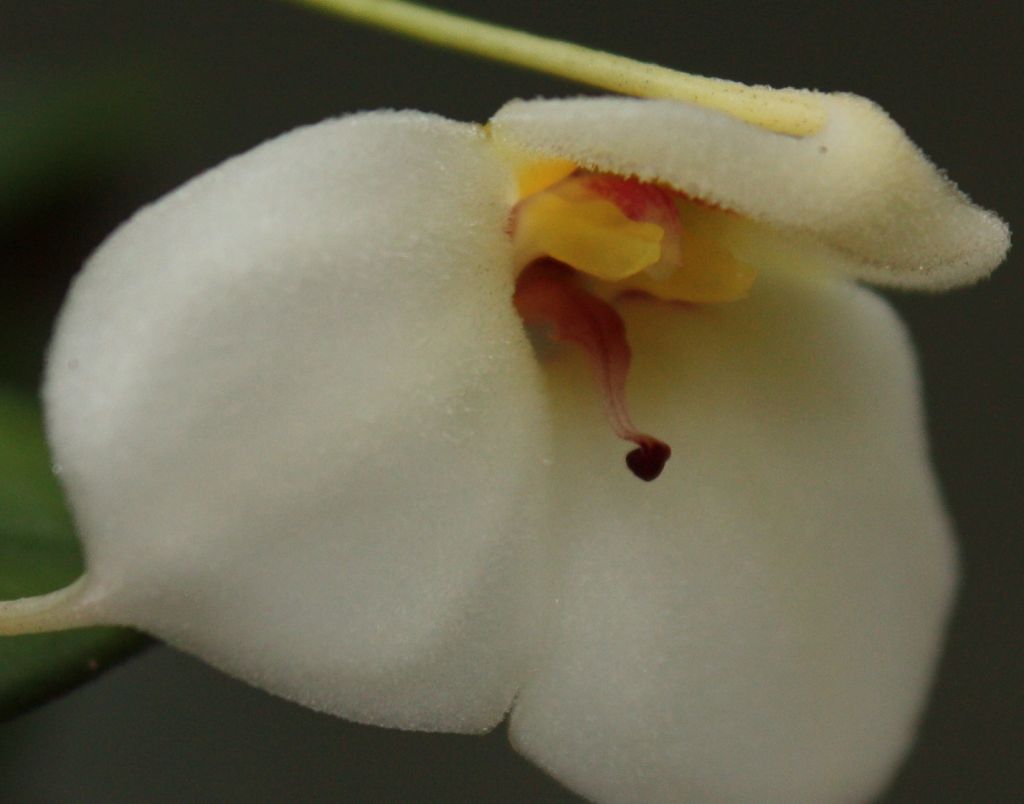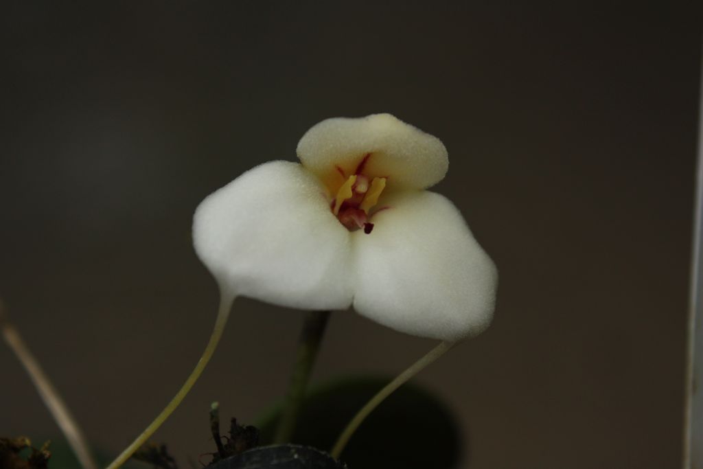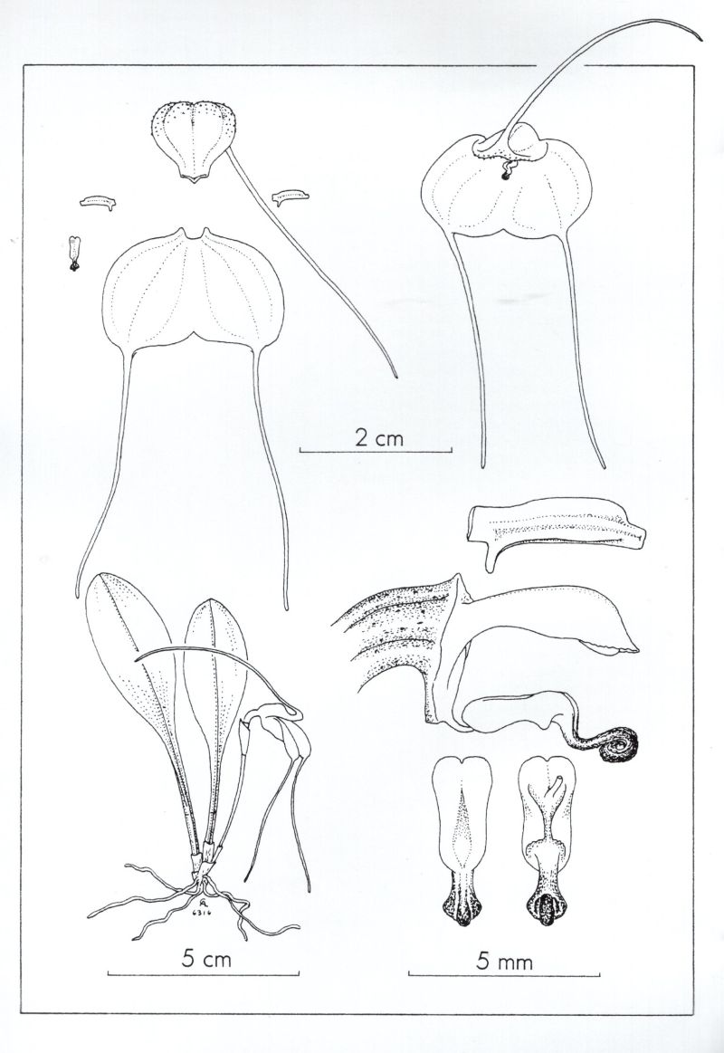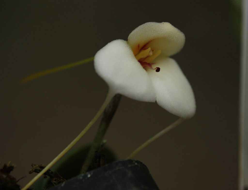 Found in southern Ecuador and northern Peru in cloud forests at 1600 to 2100 meters as a mini-miniature sized, cool to cold growing epiphytic species is with blackish, slender, erect ramicauls enveloped by 2 to 3 loose, tubular sheaths carrying a single, apical, erect, coriaceous, elliptic, obtuse leaf with a blackish petiole that blooms on an erect to ascending, slender, 1 1/5" to 1 2/5" [3 to 3,5 cm] long, single flowered inflorescence arising from low on the ramicaul with a floral bract carrying the long-lasting flower at or just below leaf height. This plant can be mounted so as to display the beautiful flowers at their maximum.