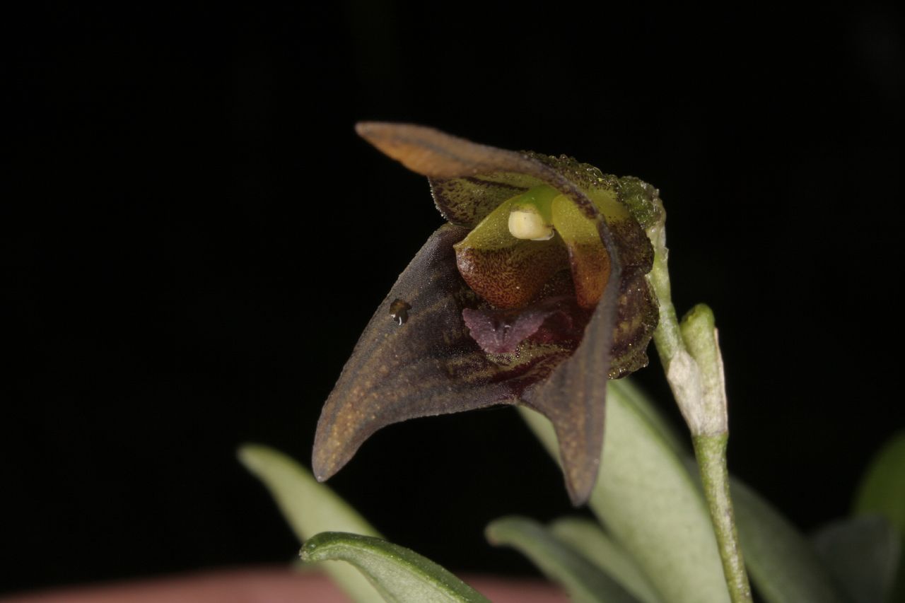 Found in Ecuador and Peru in cloud forests at elevations around 1700 to 2000 meters as a mini-miniature sized, cool growing epiphyte with blackish, erect suberect ramicauls enveloped basally by 2 to 3 short, tubular sheaths and carrying a single, apical, erect, coriaceous, elliptical, narrowly cuneate below into the blackish petiolate base leaf that blooms in the spring and summer on a slender, suberect, 1.2 to 2" [3 to 5 cm] long, single flowered inflorescence with an occasional extra successive flower arising from low on the ramicaul with a bract near the middle and a tubular floral bract