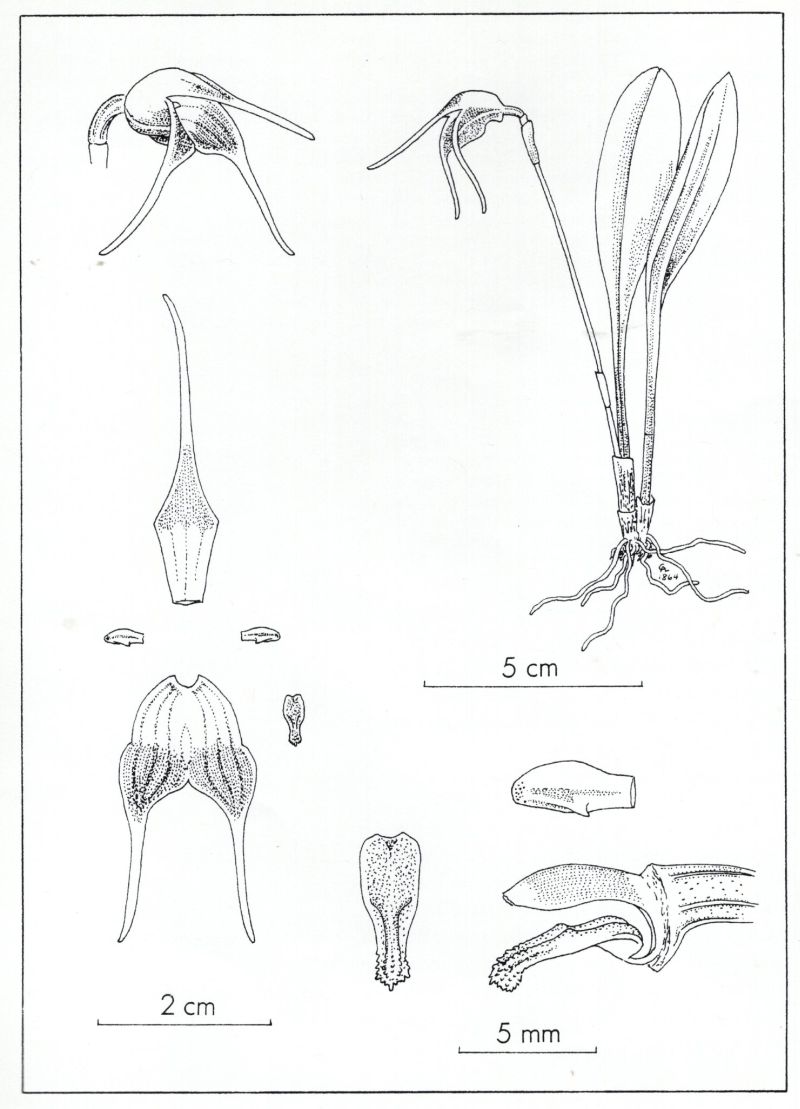Found in Antioquia department of Colombia on the western Cordillera of Colombia in cloud forests at elevations of 1700 to 2000 meters as a mini-miniature sized, cool growing epiphyte with slender, erect, blackish, ramicauls enveloped basally by 2 to 3 loose, tubular sheaths and carrying a single, apical, erect, coriaceous, elliptical, obtuse leaf that is narrowly cuneate below into the channeled petiole and blooms in the fall on a slender, erect, 2.4 to 3.4" [6 to 8.5 cm] long, single flowered inflorescence arising from low on the ramicaul, with a bract above the base and a tubular floral bract, holding the single flower at leaf height.