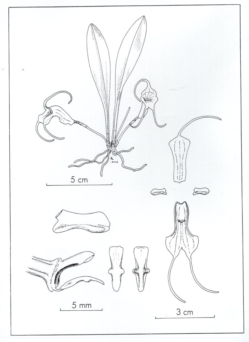 Found in southeastern Ecuador at elevations of 1100 to 1700 meters as a mini-miniature sized, warm to cool growing epiphyte with erect, slender ramicauls enveloped basally by 2 to 3 loose, tubular sheaths and carrying a single, apical, erect, coriaceous, narrowly elliptic, subacute, cunaete below into the channeled petiolate base leaf that blooms in the spring and summer on a slender, erect, 1 to 1.2" [2.5 to 3 cm] long, single flowered inflorescence arising from low on the ramicaul with a bract near the base and a tubular floral bract.