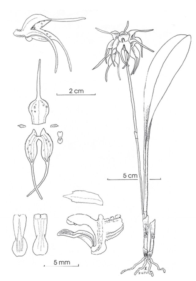 Found without locational data as a small sized, caespitose epiphyte with slender, erect ramicauls enveloped by 2 to 3, tubular sheaths and carrying an erect, thickly coriaceous, elliptical-obovate, subacute, gradually narrowing below into the petiolate base leaf that blooms in the late summer and early fall on a terete , erect, arising from a node low on the ramicaul, peduncle 6.4" [16 cm] long, rachis .4" [1 cm] long, curved, congested, simultaneously 5 to 6 flowered inflorescence with inflated, longer than the ovary floral bracts and carrying overlapping flowers with white sepals sparsely spotted pale purple, transluscent petals and a white lip.