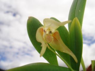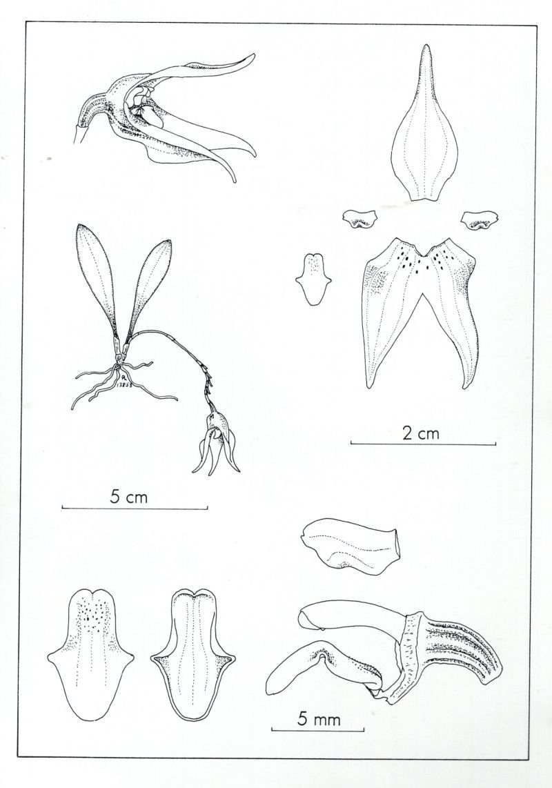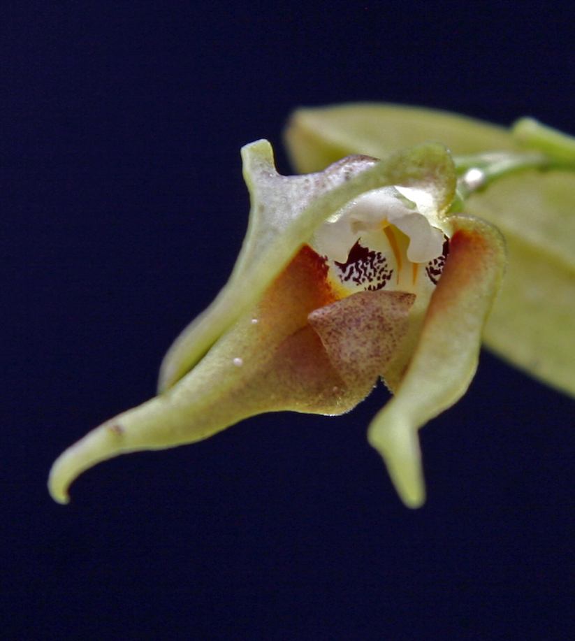 Found in Ecuador around 1600 meters as a mini-miniature sized, cool growing epiphyte with erect, slender, blackish ramicauls enveloped by 2 to 3 tubular sheaths and carrying a single, apical, erect, coriaceous narrowly elliptical, obtuse to subacute, cuneate below into the petiolate base leaf that blooms in the winter on a slender, 2" [5 cm] long, erect then pendant, successively single, to 5 flowered inflorescence arising from low on the ramicaul with a bract near the middle and another at the base and has tubular floral bracts.