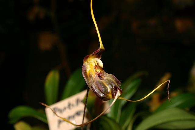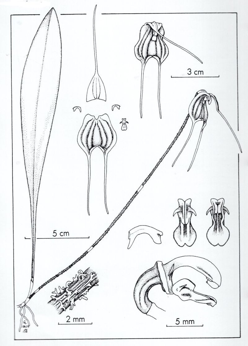 Found in southeastern Ecuador at elevations of 700 to 1000 meters as a small sized, warm growing epiphyte with short, stout, erect ramicauls that are enveloped by 2 to 3 loose, tubular sheaths carrying a single, apical, erect, thinly coriaceous, narrowly elliptic-obovate, subacute, leaf with the base narrowly cuneate into the petiole that blooms with a solitary, nutant flower sometimes followed by a second carried by a scurfy, suberect to horizontal to pendant, 4 3/4 to 9 1/2" [12 to 24 cm] long inflorescence arising from near the base of the ramicaul with 3 distant bracts and a tubular oblique floral bracts holding the flower above the leaf.