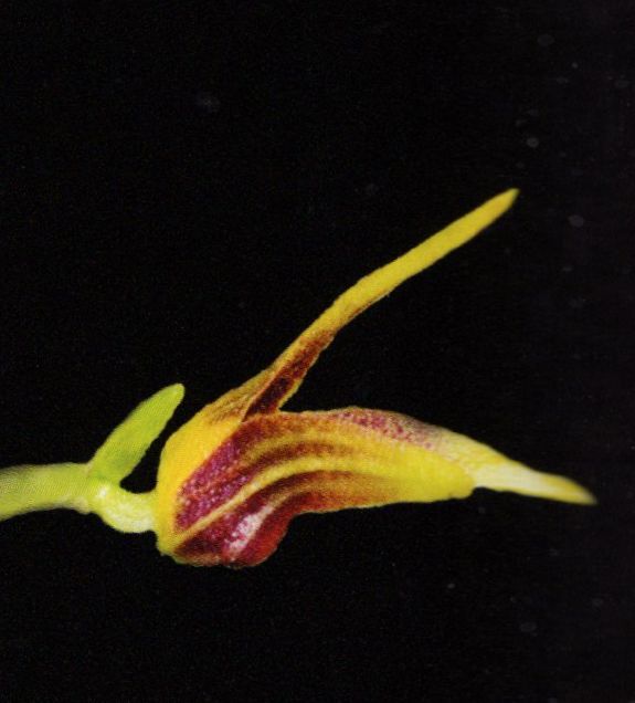 Found in Bolivia at elevations of 1200 to 1400 meters as a mini-miniature sized, warm to cool growing epiphyte with slender, erect ramicauls enveloped basally by 2 to 3, thin, close, tubular sheaths and carrying a single, apical, erect, coriaceous, narrolwy obovate, subacute, gradually narrowing below into the stout, subpetiolate base leaf that blooms on a slender, erect, .8 to 1.2" [2 to 3 cm] long peduncle, successively single, 2 flowered inflorescence arising from low on the ramicaul, witha bract above the base with a tubular floral bract, holding the single flower at mid-leaf height.