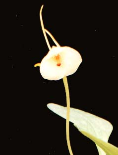 Found in Amazonas department of Peru at elevations around 2200 meters as a mini-miniature, cold growing epiphyte with erect, blackish, slender ramicauls enveloped basally by 2 to 3 close sheaths and carrying a single, apical, erect, coriaceous, elliptical, obtuse, cuneate below into the elongate, blackish petiolate base leaf that blooms in the winter on an erect to ascending, slender, 2.4" [6 cm] long, as long as the leaf, single flowered inflorescence arising from low on the ramicaul.