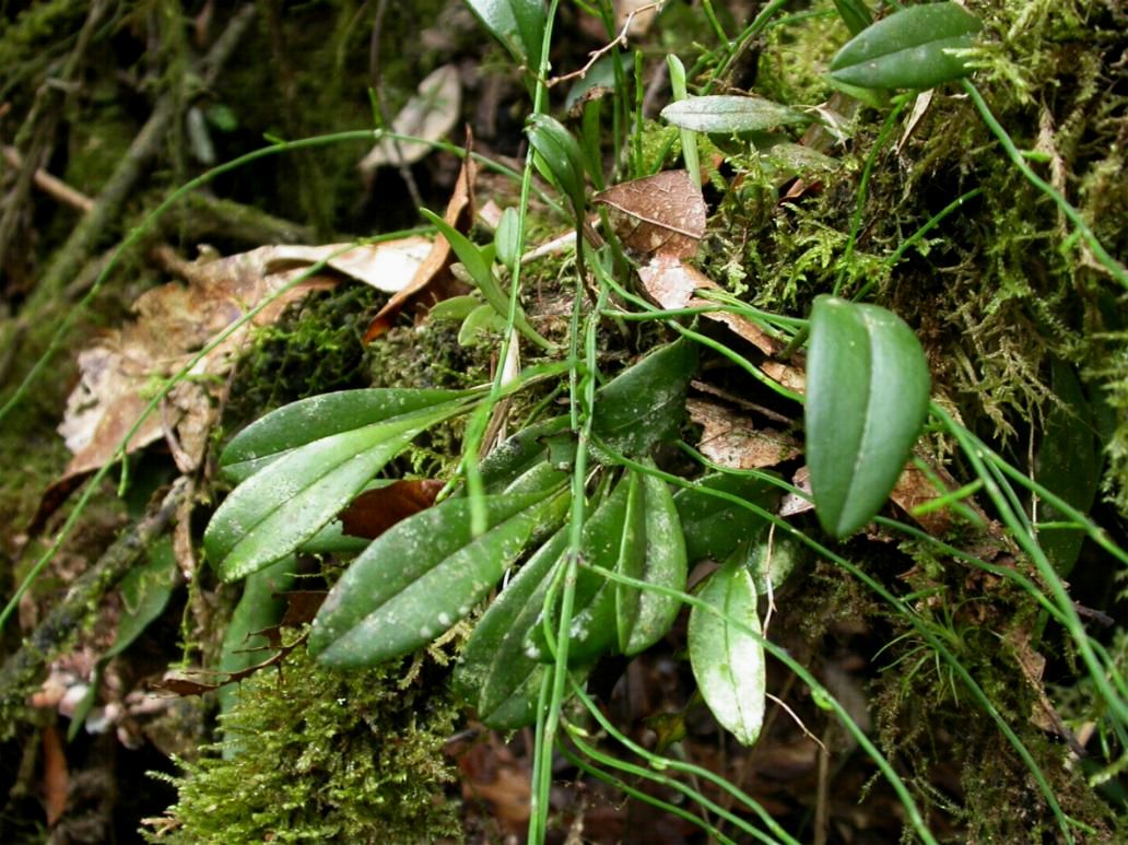 Found in Colombia and western Venezuela in cloud forests at altitudes of 1800 to 3300 meters as a mini-miniature sized, cool to cold growing, tufted, epiphyte with blackish, slender, erect ramicauls enveloped basally by 2 to 3 loose, tubular sheaths and carrying a single, apical, oblanceolate, suberect, coriaceous, petiolate, rounded at the apex leaf that is cuneate below into the petiole and blooms in the late autumn through early spring with an arcuate, short, slender, to 4" to 5" [12 to 13 cm] long inflorescence arising from low on the ramicaul, has a bract above the base and a tubular floral bract with a single, fragrant, campanulate, color variable flower that is held at or below leaf height.