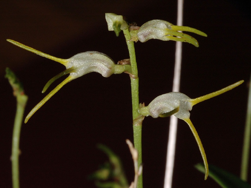 Found in Ecuador on the western slopes of the Andes at elevations of 2000 to 3300 meters as a mini-miniature sized, cold growing epiphyte or terrestrial with slender ramiucals enveloped by a loose, ribbed, tubular sheath and carrying a single, apical, erect, coriaceous, obovate, obtuse to subacute, tridenticulate, gradually cuneate below into the grooved, petiolate base leaf that blooms in the winter on an erect, 3.6" to 5.2" [9 to 13 cm] long, subsecund, loosely few flowered inflorescence arising from low on the ramicaul with a loose, oblique floral bract.