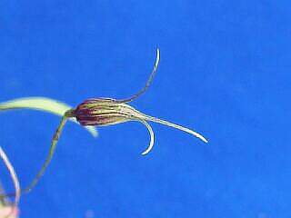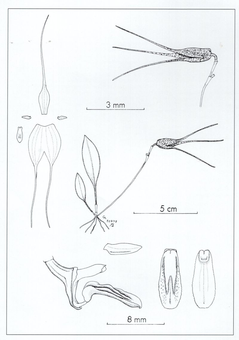Found in southwestern Ecuador on the western slopes of the foothills of the Andes at elevations around 2000 meters as a mini-miniature sized, cool to cold growing epiphyte with slender, erect ramicauls enveloped basally by 2, loose, tubular sheaths and carrying a single, erect, coriaceous, elliptical, acute, narrowly cuneate below into the elongate petiolate base leaf that blooms in the spring on a slender, suberect to horizontal, 1.6 to 2.4" [4 to 6 cm] long, successively few flowered inflorescence arising from low on the ramicaul with a bract at the base and another in the lower quarter, and has a tubular floral bract