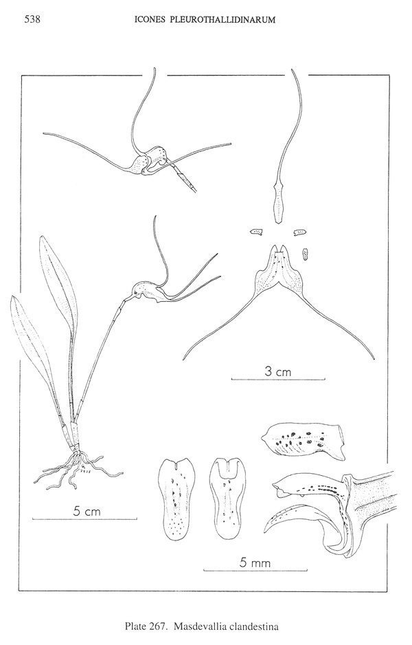 References W3 Tropicos, Kew Monocot list , IPNI ; Orquideologia Vol 16 #1 1983 drawing fide; Icones Pleurothallidinarum XXII Masdevallia Part 3 Luer 2001 drawing fide; Masdevallia's in Kleur Vol 1 P M Oversteegen, Eisses & A P Sijm 2001 photo fide; Libro Rojo de Plantas De Colombia Vol 6 Primera Parte Saenz 2007; Orchids Masdevallia with its segregates including Dracula Zelenko 2014 photo fide;