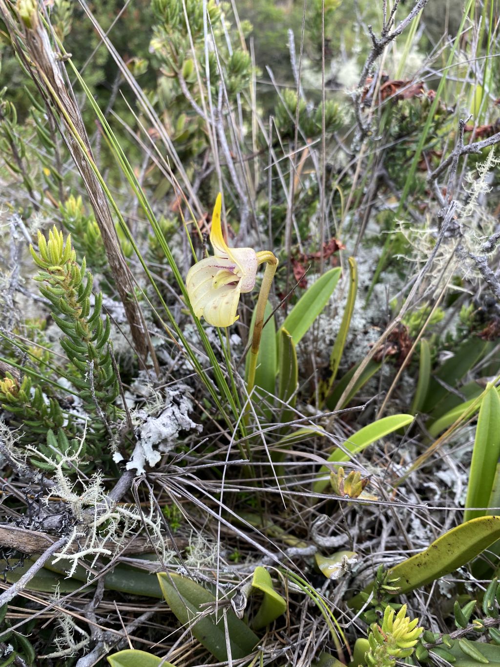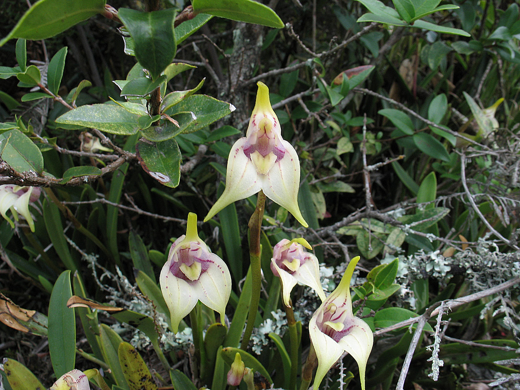 Found in Colombia, Ecuador and Peru in cloud forests at elevations of 2200 to 3700 meters as a miniature to just small sized, tufted, cold growing, epiphytic or lithophytic species with short, erect ramicauls enveloped basally by 2 to 3 tubular sheaths and carrying a single, apical, erect, linear-oblanceolate, coriaceous, keeled and conduplicate below into the channeled base leaves and are pale green with purple spots. This little orchid blooms on a erect, slender, 5 to 7" [12.5 to 17.5 cm] long, single flowered inflorescence arising from low on the ramicaul with a bract near the base and a floral bract holding the single flower amid or just above the leaves occuring in the spring and summer.