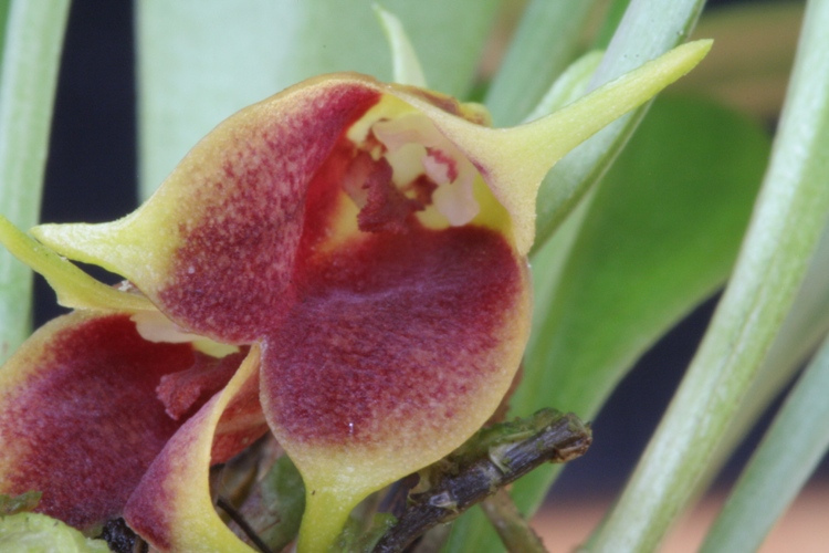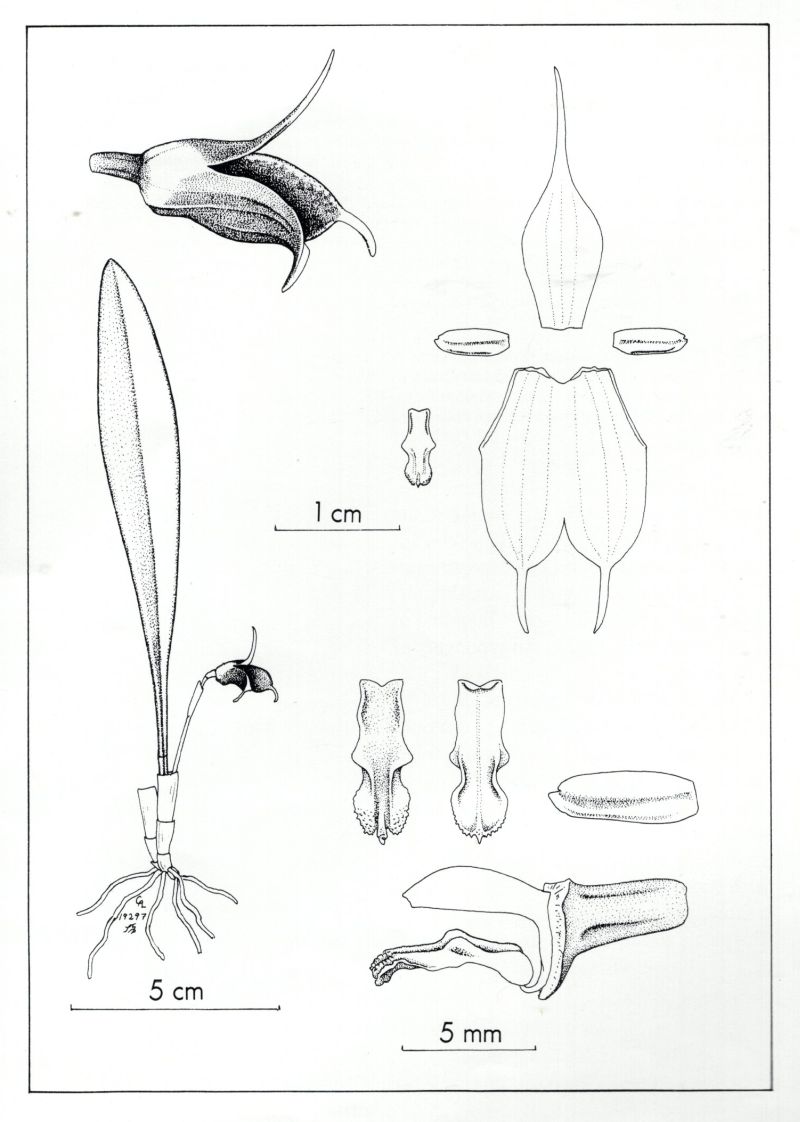 Found in Peru without collection data as a miniature sized epiphyte with slender, erect, ramicauls enveloped by 2 to 3 tubular sheaths and carrying a single, apical, erect, coriaceous, narrowly elliptical, subacute, gradually narrowing below into the shortly petiolate base leaf that blooms in the later fall and early winter on an erect, terete, .8 to 1" [2 to 2.5 cm] long, a single flowered inflorescence followed by another single flower after an interval, arising from low on the ramicaul, with a bract at the base and tubular floral bracts.