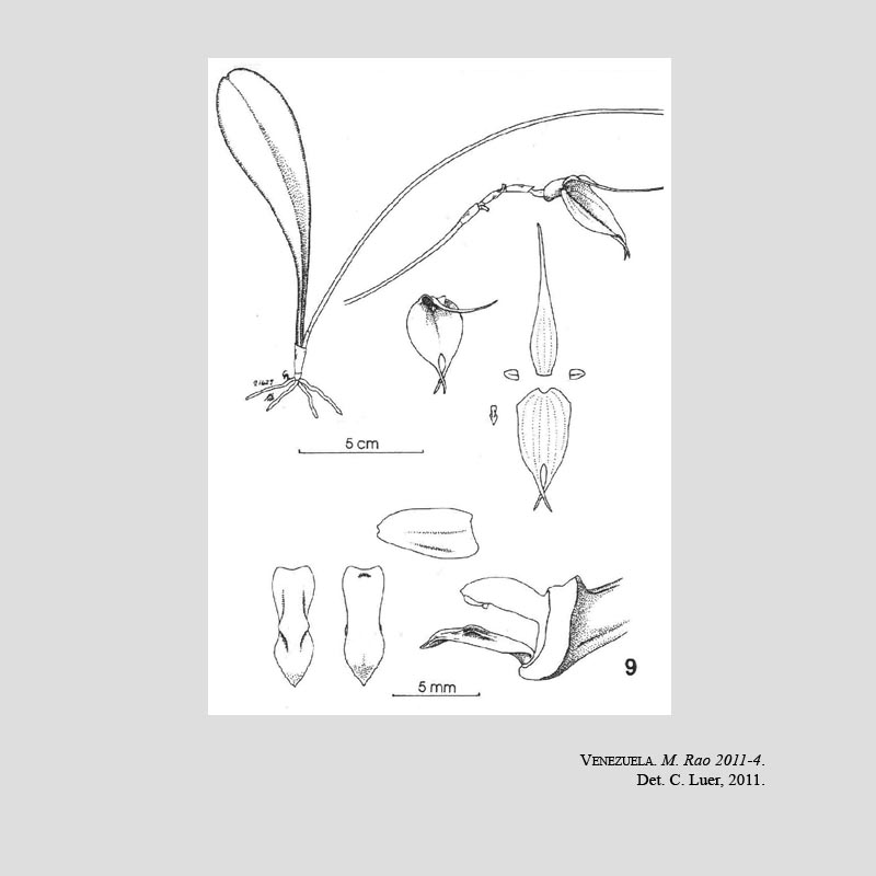 Found in Venezuela without locational data as a miniature sized epiphyte with erect, stout ramicauls enveloped by a 1 to 2 tubular sheaths and carrying a single, apical, erect, coriaceous, obovate, obtuse to rounded, cuneate below into the petiolate base leaf that blooms in the spring on an erect to arching, slender, triquetrous, 9.2" [23 cm] long including the 8" [20 cm] long peduncle, successively single, few flowered inflorescence with a bract at the base, arising from low on the ramicaul and holding the flower more or less at the height of the leaf.