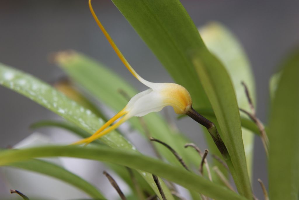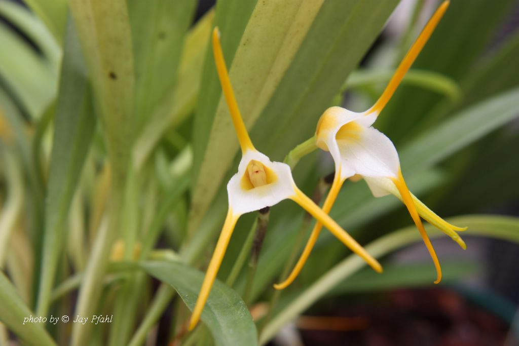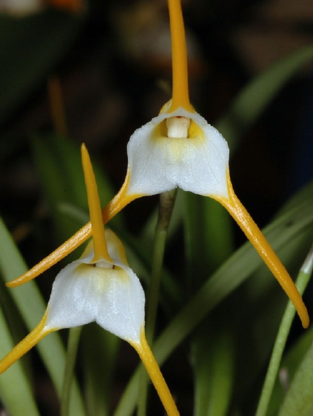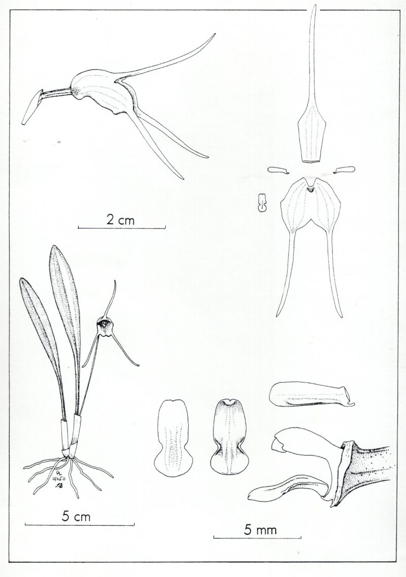 Distinguished from others by its white sepals lightly suffused with yellow towards the base and thick orange, straight tails, an uncinate and minute basal tooth on the petals, a white and pandurate lip that is briefly narrowed between the lower 2/3's and the rounded apical 1/3 and the practically smooth disc with barely visible elevations along the lateral veins.