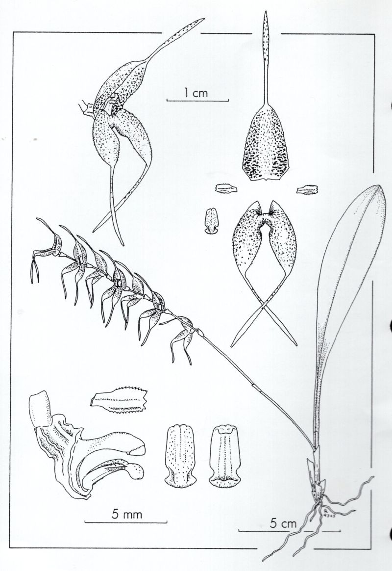 Found in central Ecuador in cloud forests at elevations around 2650 meters as a miniature sized, cold growing epiphyte with slender ramicauls enveloped by 2 to 3 loose tubular sheaths and carrying a single apical, erect, coriaceous, elliptical, subacute, narrowly cuneate below into the .4 to 1.2" [1 to 3 cm] long, petiolate base leaf that blooms in the late winter and early spring on a slender, suberect, 6.8" [17 cm] long, loose, racemose, simulataneously several flowered inflorescence arising from low on the ramicaul with a bract below the middle and an inflated floral bract.