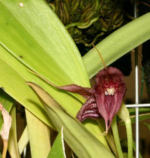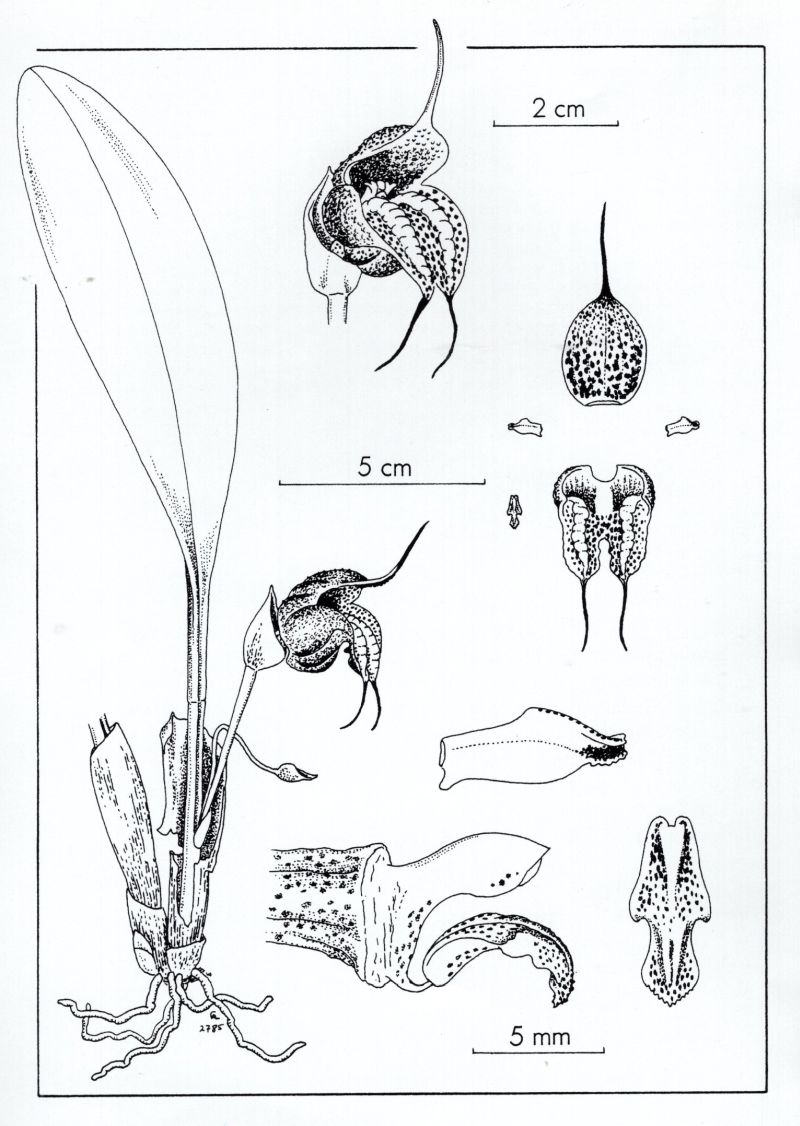 Found in the Putumayo department of Colombia on the eastern slopes of the Andes in cloud forests at elevations of 2200 to 2600 meters as a small sized, cold growing epiphyte with stout, channeled, erect ramicauls enveloped basally by 1 to 2 shorter sheaths and carrying a single, apical, erect, coricaeous, elliptical, obtuse leaf that is cuneate below into the channeled petiole and blooms in the summer on a very short, erect, single flowered inflorescence arising from high on the ramicaul carrying inflated, oblique, obtuse floral bracts with the flower held below the leaves.