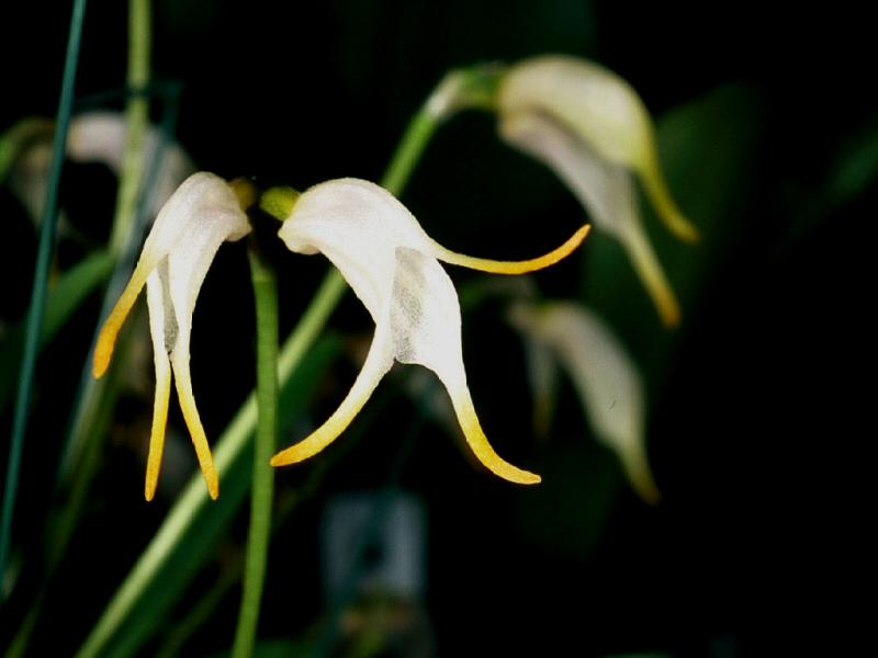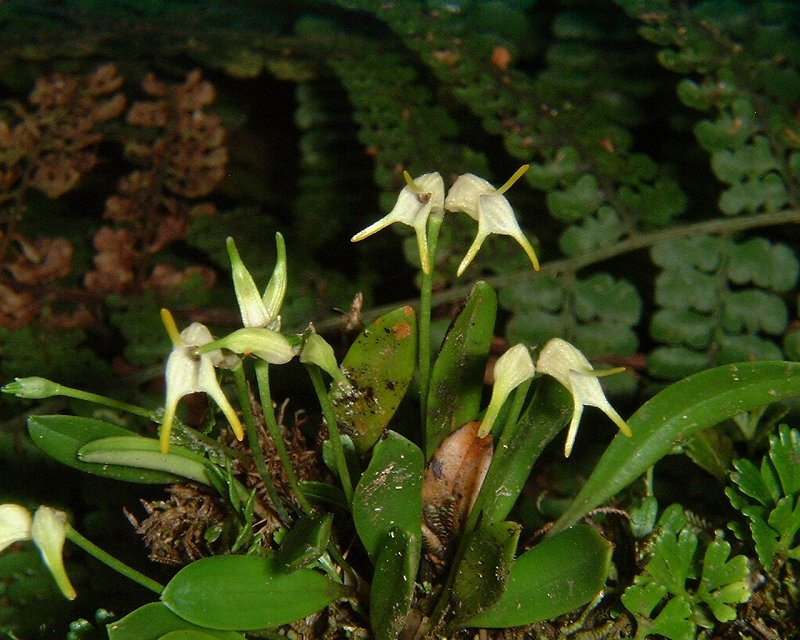 Found from Guatemala, Honduras, Nicaragua, Costa Rica, Panama and only Ecuador in South America in premontane and lower montane cloud forest high in the canopies of trees at elevations of 500 to 2000 meters as a mini-miniature sized, warm to cool growing orchid with a short, erect, slender ramicaul enveloped basally by 2 to 3 loose, tubular sheaths carrying a single, erect, subcoriaceous, narrow, linear-obovate leaf that narrrows below the middle into the subpetiolate base which blooms in the spring with a slender, erect, 1 3/4" [4.5 cm] long inflorescence arising from low on the ramicaul with a bract below the middle and 2 thin, imbricating floral bracts carrying 2 simultaneous flowers held higher than the leaves .