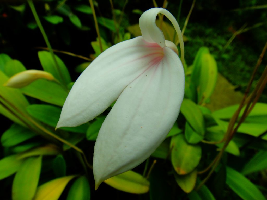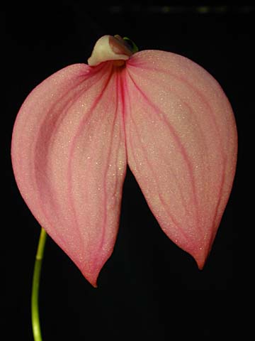 Found in Colombia as a small sized, cold growing terrestrial on sides of rocky cliffs with erect leaves that is found at elevations of 2400 to 3000 meters and blooms in the spring with short ramicauls enveloped by 2 to 3 close, tubular sheaths carrying a single, apical, oblong-lanceolate to spathulate, petiolate, rounded and minutely tridentate apically leaf that blooms in the later spring and summer on a slender, erect, to 12" [30 cm] long, slightly flexous, single flowered, inflorescence with a spotted bract at each node and the waxy, variable sized flowers held higher than the leaves.