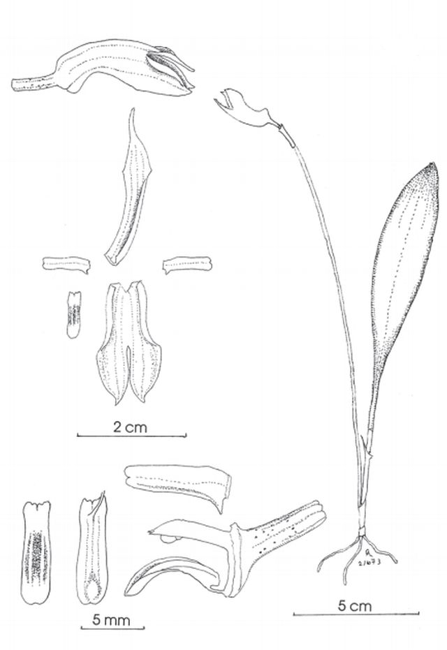 Found in Puno department of Peru at elevations around 2000 meters as a miniature sized, cool to cold growing, caespitose epiphyte with slender, erect, terete ramicauls enveloped by a tubular sheath above and another at the base carrying an erect, coriaceous, elliptical-obovate, subacute, gradually narrowing below into the long-petiolate base leaf that that blooms in the later spring on a slender, erect to suberect, peduncle 2" [5 cm] long, single flowered inflorescence with shorter than the pedicels floral bracts and carrying flowers with snow white sepals with a dark spot on either side above the base, white petals and a white lip