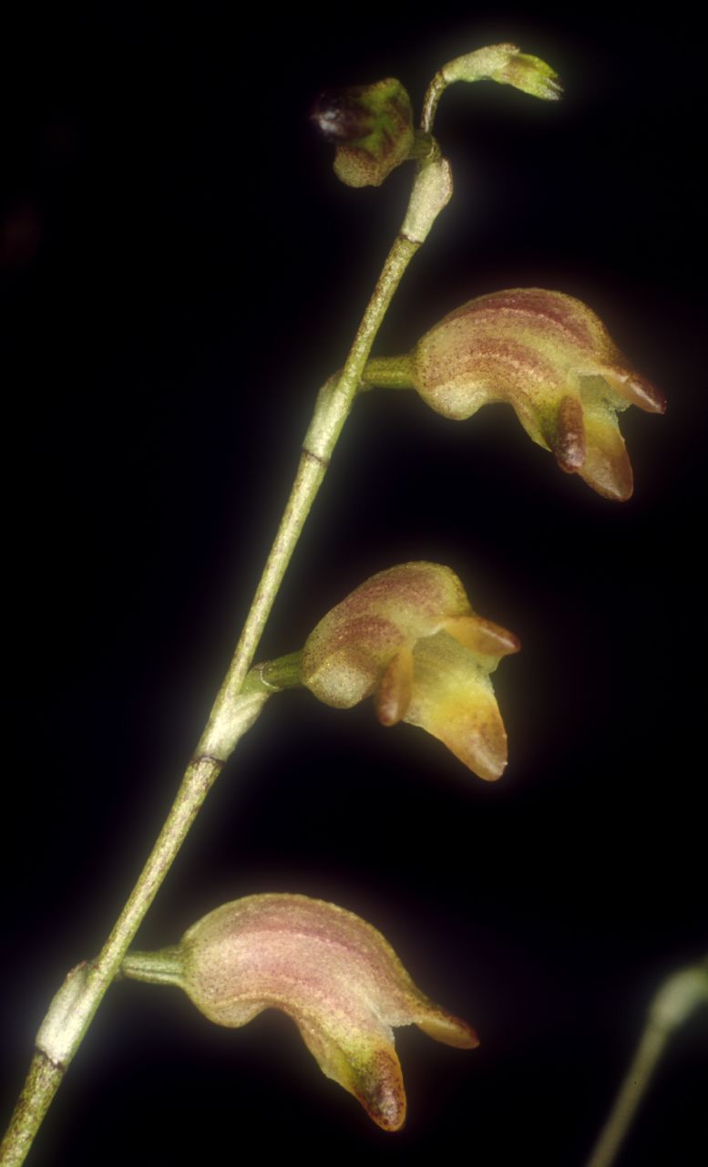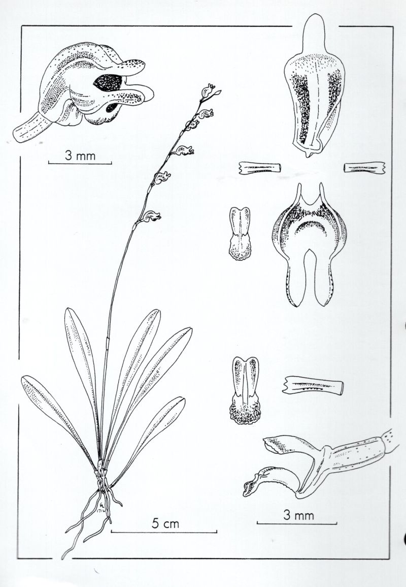 Found in Ecuador on the western slopes of the Andes at altitudes of 1600 to 2200 meters as a miniature sized, cool to cold epiphyte with erect, slender ramicauls enveloped basally by 2 to 3 thin, tubular sheaths and carrying an erect, coriaceous, oblanceolate, apical, leaf that is conduplicate towards the base and blooms in the late spring on an erect, loose, subsecund 8" [20 cm] long, simultaneously several flowered, racemose inflorescence arising from low on the ramicaul with the flowers opening in succesion from the bottom up.