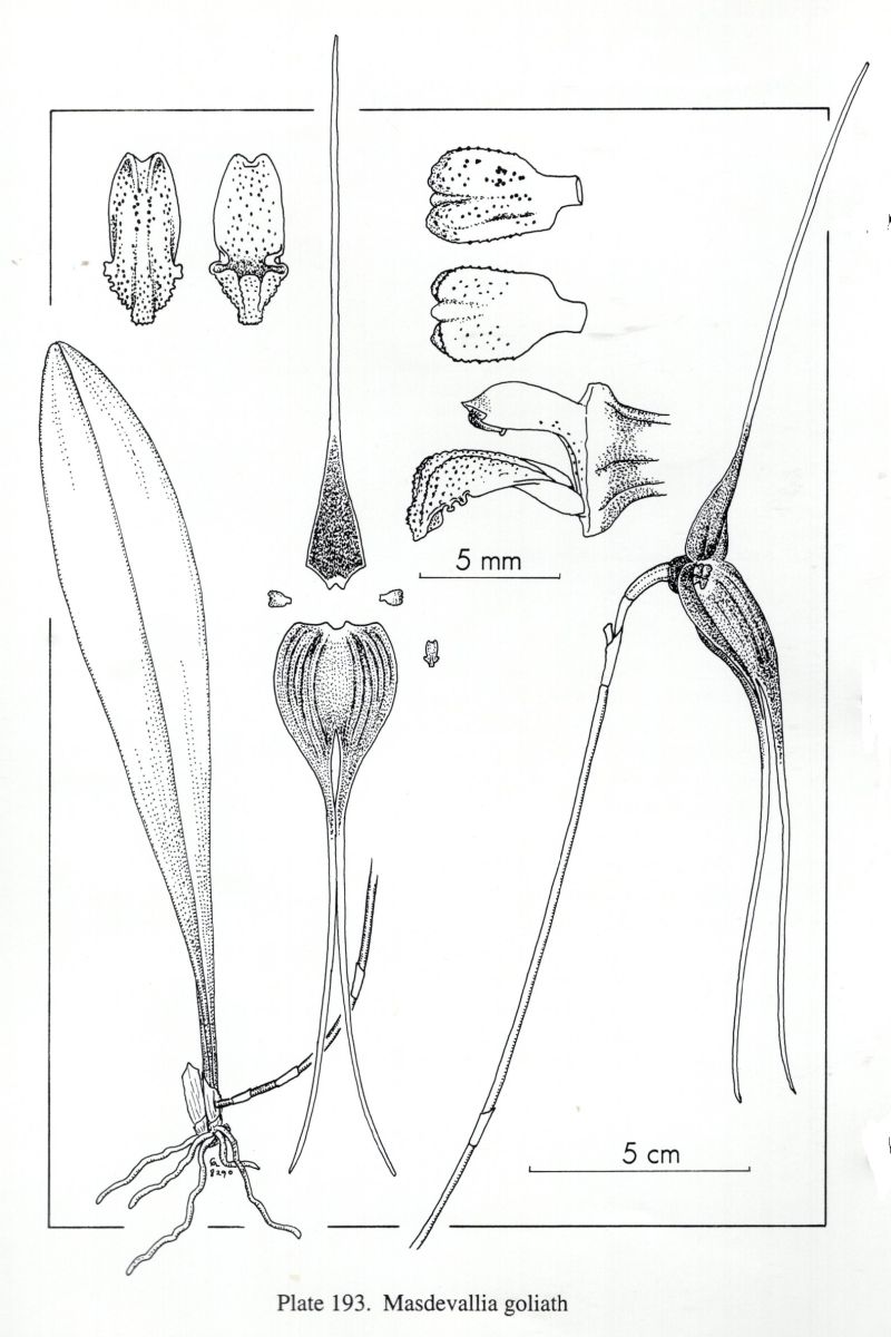 References W3 Tropicos, Kew Monocot list , IPNI ; A Treasure of Masdevallia Vol 23 Luer & Dalstroem 1998 watercolor/drawing fide; Icones Pleurothallidinarum XXI Systematics of Masdevallia Part 2 Luer 2000 drawing fide; Masdevallia's in Kleur Vol 1 P M Oversteegen, Eisses & A P Sijm 2001 photo fide; Native Ecuadorian Orchids Vol 3 Dodson 2002 photo fide; Icones Pleurothallidinarum Vol XXVIII Luer 2006 as Regalia goliath; AOS Bulletin Vol 76 #11 2007 photo fide; Orchidaceae Masdevallia and Affiliates Dodson & Luer 2009 as Regalia goliath drawing fide; Orchids Masdevallia with its segregates including Dracula Zelenko 2014 photo fide;