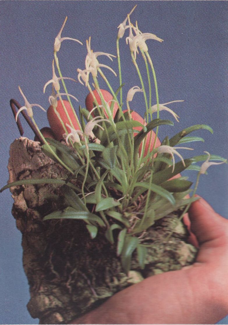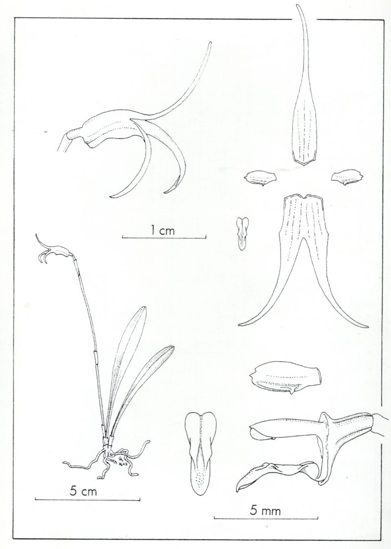 Found in Bolivia in forests at the edge of foothills at elevations of 270 to 500 meters as a mini-miniature sized, hot to warm growing epiphyte with erect, slender ramicauls enveloped basally by 2 to 3 thin, tubular sheaths carrying a single, apical, erect, coriaceous, 1.6" to 2.6" [4 to 6.5 cm] long, narrowly obovate, obtuse leaf that is gradually narrowed below into the subpetiolate base and has a slender, erect, single flowered, 2.4" to 4" [6 to 10 cm] long inflorescence arising from low on the ramicaul with a bract below the middle and a tubular floral bract holding the flower well above the leaves.