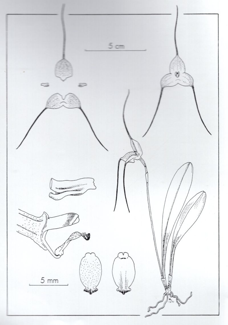 References W3 Tropicos, Kew Monocot list , IPNI ; Systematics of Masdevallia Vol 2 Luer 1986; Icones Orchidacearum Peruviarum Plate 296 Bennett & Christenson 1995 drawing fide; Orchid Australia Vol 11 No 2 1999 photo; Masdevallia's in Kleur Vol 1 P M Oversteegen, Eisses & A P Sijm 2001 photo fide; Icones Pleurothallidinarum XXIII Systematics of Masdevallia Part 4 Luer 2002 drawing fide; Native Ecuadorian Orchids Vol 3 Dodson 2002 drawing/photo fide; A Treasure of Masdevallia Vol 27 Luer & Dalstroem 2004 watercolor fide; Orchid Species of Peru Zelenko Bermudez 2009 photo fide; Orchidaceae Masdevallia and Affiliates Dodson & Luer 2009 drawing fide; Las Orquideas del Peru Izerskyy & Bezverhov 2011 photo fide; Orchids Masdevallia with its segregates including Dracula Zelenko 2014 photo fide;