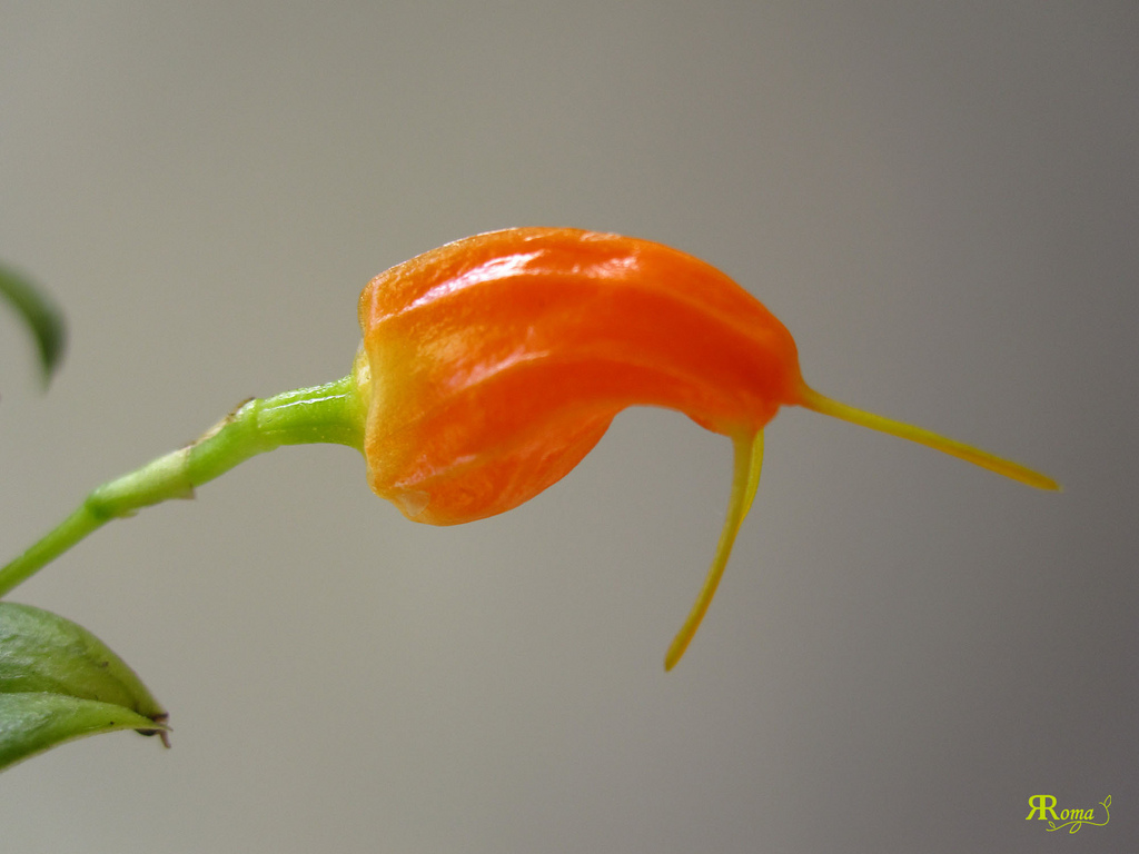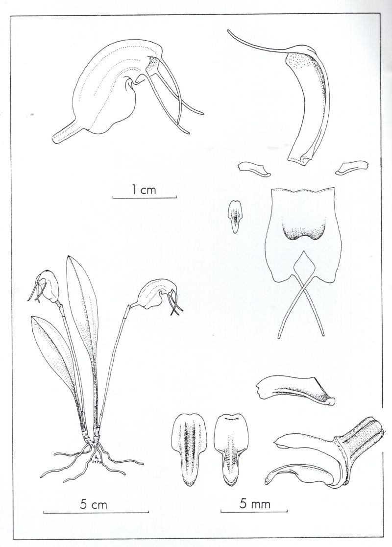 Found in southwestern Ecuador at altitudes of 1400 to 2400 meters as a mini-miniature sized, cool to cold growing epiphyte blooming with blackish, erect, slender ramicauls enveloped by 2 to 3 loose, tubular sheaths carrying a single, apcial, elliptical, acute leaf with the base narrowly cuneate into the petiole and blooms in the summer and fall on an erect to horizontal, slender, 5" [13 cm] long, solitary flowered inflorescence arising from low on the ramicaul with a bract near the base and a tubular floral bract holding the long-lasting, waxy flower at or just amid the leaves.