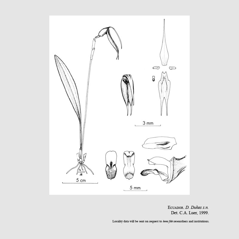 Found in Zamora-Chinchipe department of Ecuador without collection data as a miniature sized, epiphyte with blackish, slender, erect, ramicauls enveloped by 2 to 3, loose, tubular sheaths and carrying a single, apical, erect, coriaceous, elliptical, subacute, narrowly cuneate below into the petiolate base leaf that blooms in the late summer and early fall on an erect, slender, triquetrous, subdense, 5.6" [14 cm] long, a successively few flowered inflorescence arising from low on the ramicaul.
