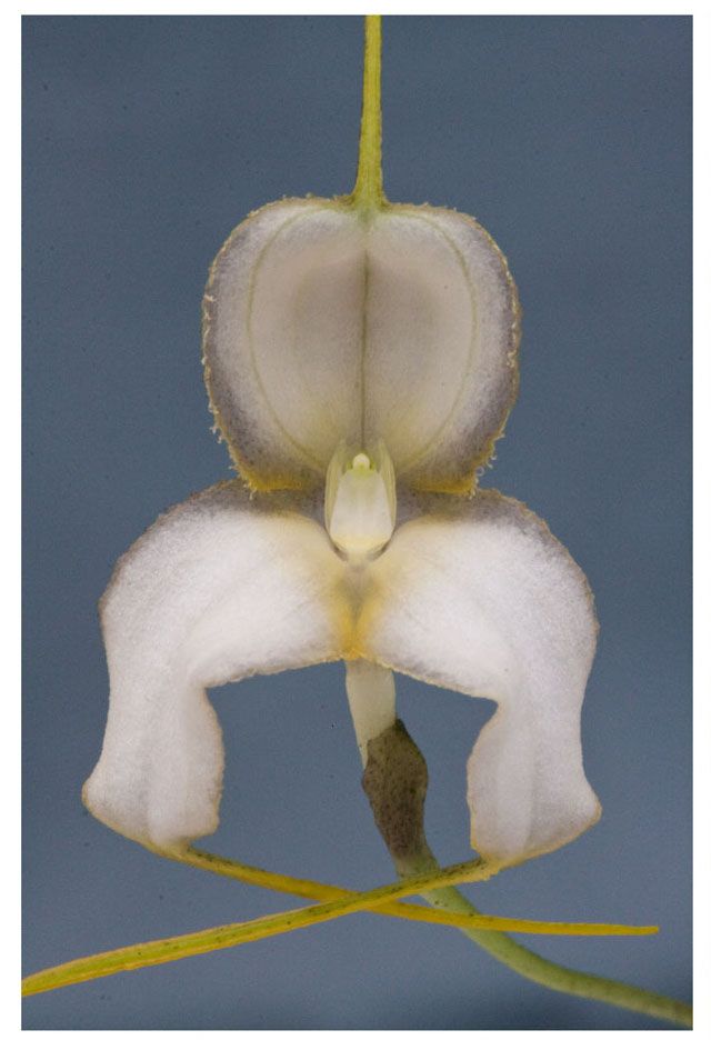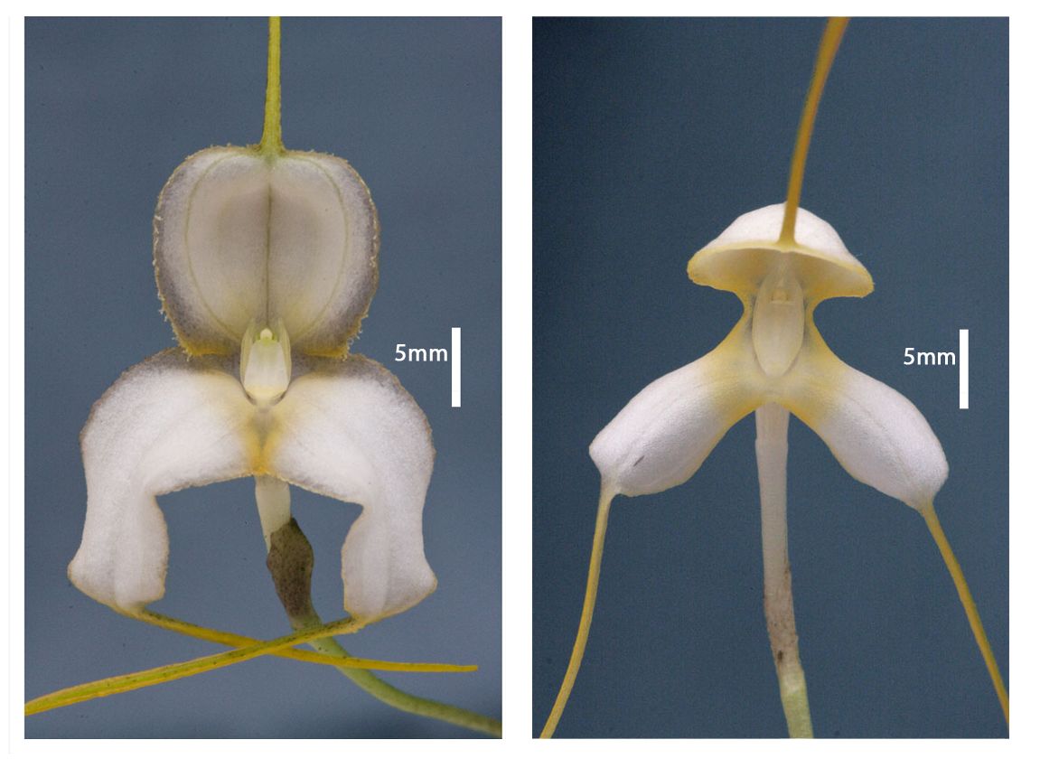 Found in Colombia where it presumably grows as an epiphyte in cloud forests. The plants are miniature, caespitose herbs with obovate, petiolate leaves 4-7 cm long x 1.5-2.0 cm wide, and short stems, 1.0-2.0 cm long, enveloped by 2-3 loose papery sheaths. The single flowered inflorescences can arise at most any time of the year and produce white flowers that are held horizontally from the plant. The peduncle is terete, 7.2 cm long x 0.2 cm wide. The pedicel is terete, 1.0 cm long x 0.2 cm wide. The ovary is sulcate, 0.7 cm long x 0.2 cm wide. The dorsal sepal is ovate, white becoming translucent towards the minutely fimbriate margins, suffused with golden-yellow towards the base, 1.5 cm long x 1.4 cm wide, and abruptly contracted into a yellow or green tail at the apex, 2.9 cm long. The lateral sepals are similar in morphology to the dorsal sepal but have entire to minutely errose margins, are slightly larger 1.8 cm long x 1.0 cm wide, and are contracted into a shorter tail 2.5 cm long. The petals, 0.4 cm long x 0.2 cm wide, and the lip, 0.4 cm long x 0.3 cm wide, and the column, 0.4 cm long x 0.15 cm wide, are typical for the subsection Caudatae.