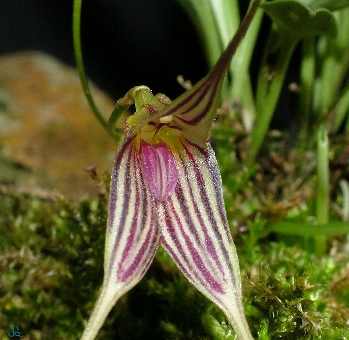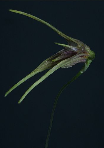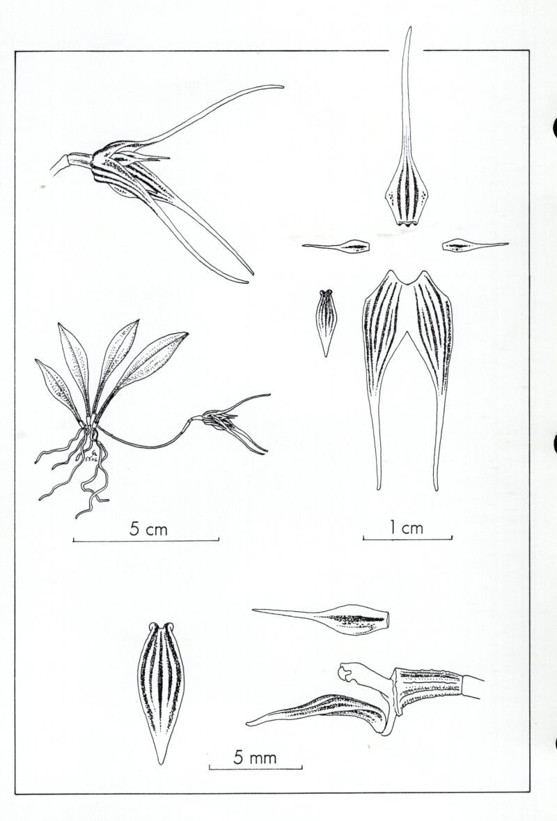 Found in southeastern Ecuador in rainforest at elevations of 300 to 1800 meters although it is much more common at the higher elevations as a mini-miniature sized, hot to cool growing, epiphyte with slender, erect, blackish ramicauls enveloped by 2 to 3, close, tubular sheaths carrying a single, apical, erect, coriaceous, narrowly elliptic, acute leaf that is narrowly cuneate below into the blackish petiole and blooms in the spring on a transverse, slender, 1 1/8" to 1 2/5" [3 to 3.5 cm] long inflorescence arising from low on the ramicaul with a bract near the base and a floral bract carrying a solitary flower that is held below the leaves.