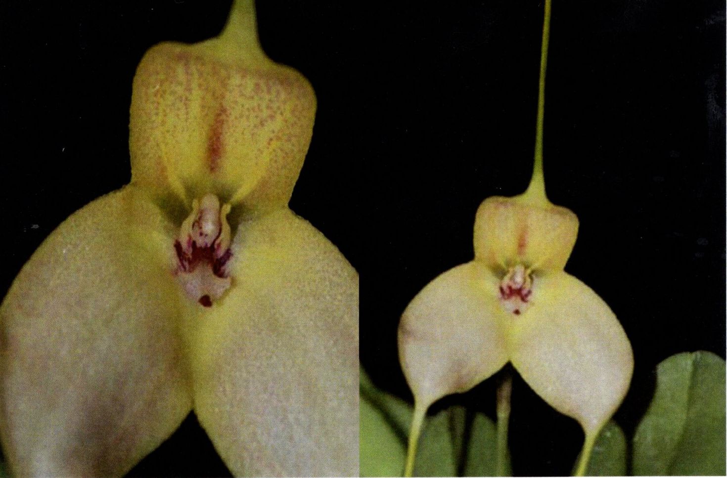 Found in Zamora-Chinchipe province of Ecuador without locational data as a mini-miniature sized, presumably at least cool growing caespitose epiphyte with slender, erect blackish ramicauls enveloped by 2 to 3 tubular sheaths and carrying a single, erect, coriaceous, dark green, elliptical, obtuse to subacute, cuneate below into the blackish petiolate base leaf that blooms in the fall on an erect, slender peduncle 2.2" [5.5 cm] long, with a bract near the base from low on the ramicaul, single flowered inflorescence with as long as the pedicel and carrying flowers with light yellow green dotted with red within sepals, yellow-white with purple dots petals and a white, marked with purple lip.