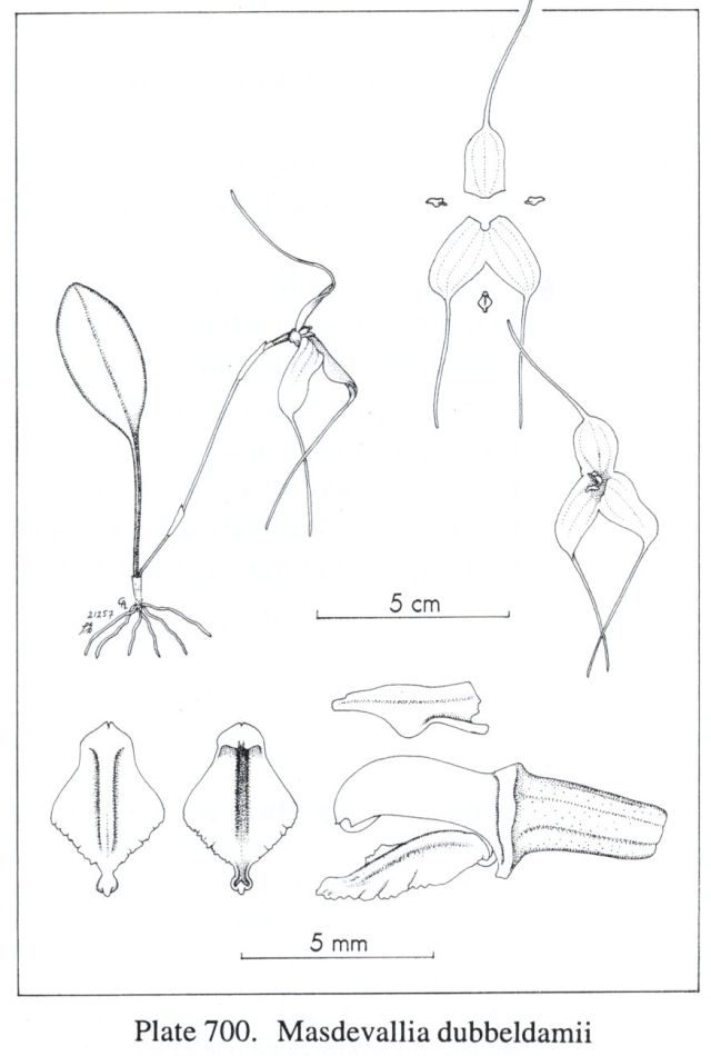 "The species is very similar to Masdevallia dalesandoi differing most in the labellum. Although probably of little consequence, the leaves of M dubbeldamii are broad and Obtuse while those of M dalesandroi are narrow and acute. The sepals and petals are similar in size, shape and color, but the lip of M dubbeldamii is rhombic while M dalesandroi is elliptical. In addition, the margins of the lip of M dubbeldamii are minutely crisped and undulate and markedly constricted below the apex to create a terminal lobule." Luer 2009