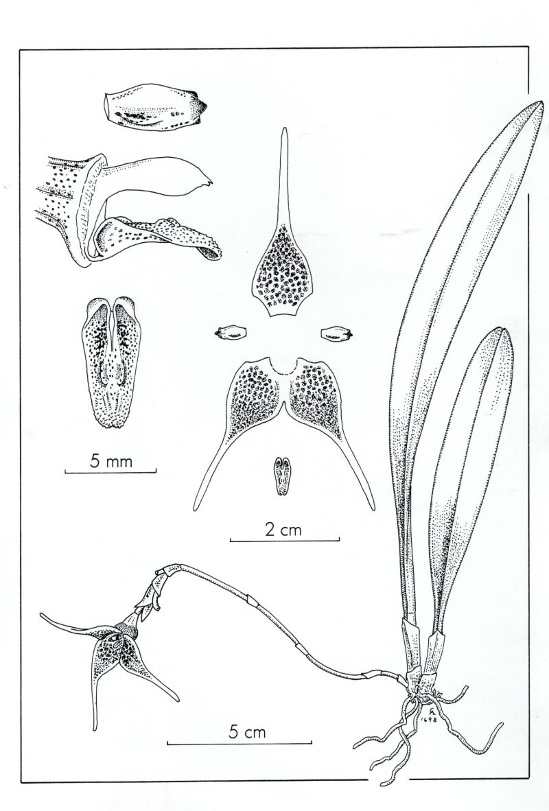 Found in southern Ecuador and northern Peru on trunks of fallen trees at elevations of 2200 to 3150 meters as a small sized, cold growing epiphytic species with stout erect ramicauls enveloped basally by 2 to 3 loose tubular sheaths carrying a single, apical, erect, thickly coriaceous, rigid leaf with a linear to elliptcal, obtuse blade that becomes narrowly cuneate below into the channeled petiole. This species blooms on a successively flowered, congested, descending to pendant, racemose, 9 1/4" to 16" [23 to 40 cm]long inflorescence with 4 to 5 bracts and thin imbricating floral bracts all arising from low on the ramicaul.