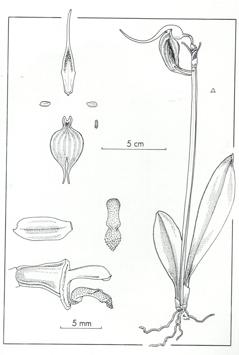 Found in Huila department of southern Colombia and Ecuador at altitudes around 850 meters in Colombia and 2700 meters in Ecuador as a miniature to small sized, warm or cold growing, caespitose epiphyte with a stout, erect ramicaul enveloped by 2 to 3 loose, tubular sheaths carrying a single, apical, erect, thickly coriaceous, elliptical, subacute leaf that is cuneate below into a channeled petiolate base blooming in the later summer and fall on a stout, erect, congested, 6" to 9" [16 to 23 cm] long, successively several, solitary flowered, triquetrous infloresence arising from the base of the ramicaul with a basal bract and tubular, thin, imbricating floral bracts with the flowers held well above the leaves.