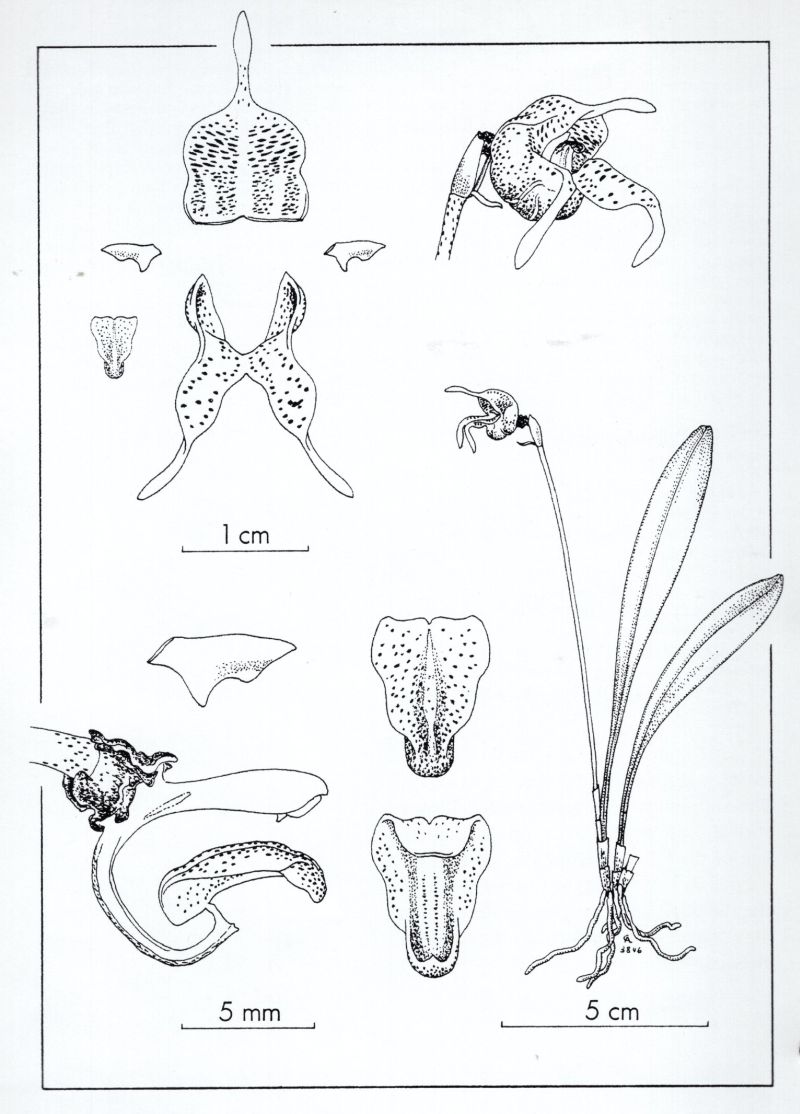 Found in Ecuador in cloud forests at altitudes of 1400 to 2800 meters as a mini-miniature to miniature sized, cool to cold growing epiphyte and sometimes terrestrial orchid with slender, erect, green with purple dots ramicauls enveloped basally by 2 to 3 close, tubular sheaths carrying a single, apical, erect, coriaceous, petiolate, elliptical, subacute leaf that is gradually narrowed below into the channeled petiole which blooms in the fall and winter on a slender, erect, single flowered inflorescence arising from low on the ramicaul with a bract below the middle and an inflated floral bract.