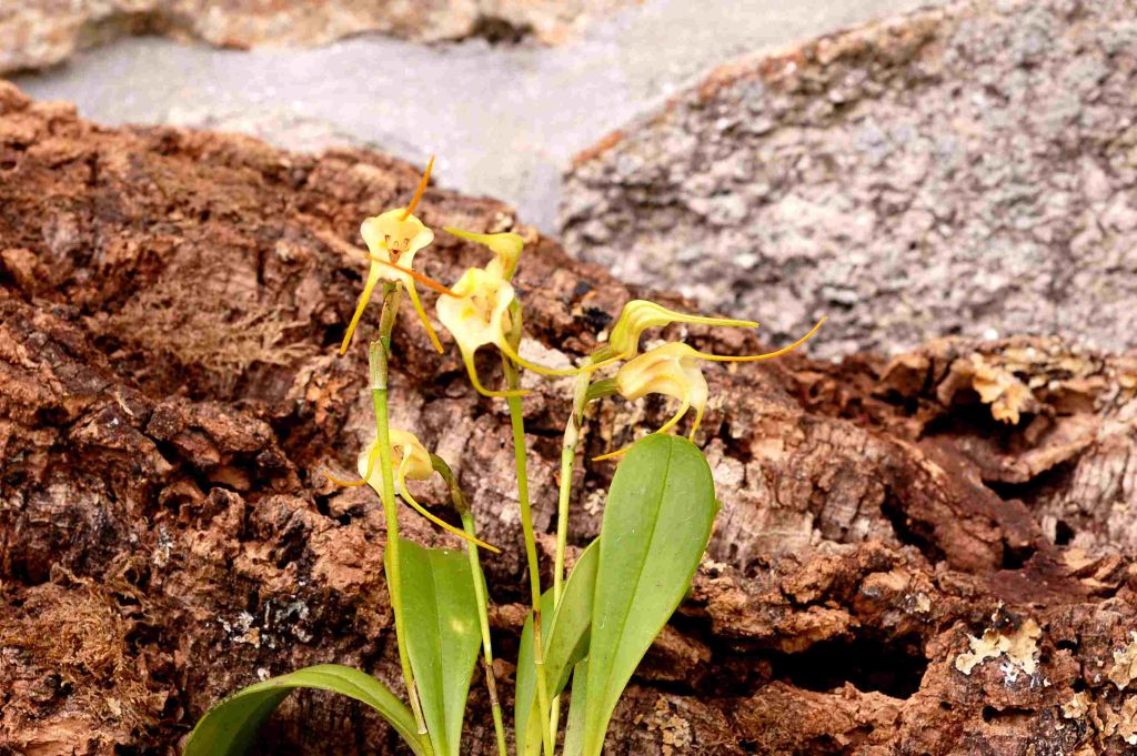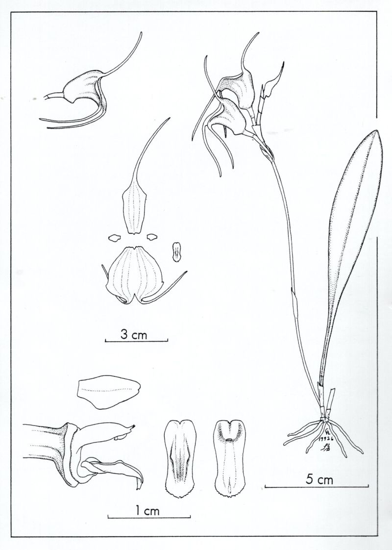 Found in Panama at eleavtions of 1900 to 2000 meters as a miniature sized, cool growing epiphyte with slender, erect ramicauls enveloped basally by 2 loose, tubular sheaths and carrying a single, apical, erect, coriaceous, narrowly elliptical-obovate, obtuse, gradually narrowing below into the petiolate base leaf that blooms in the winter and spring on a slender, erect, 4.4 to 5.2" [11 to 13 cm] long, rapidly successive to simultaneously few flowered, racemose inflorescence arising from low on the ramicaul with a bract at the base and oblique floral bracts.