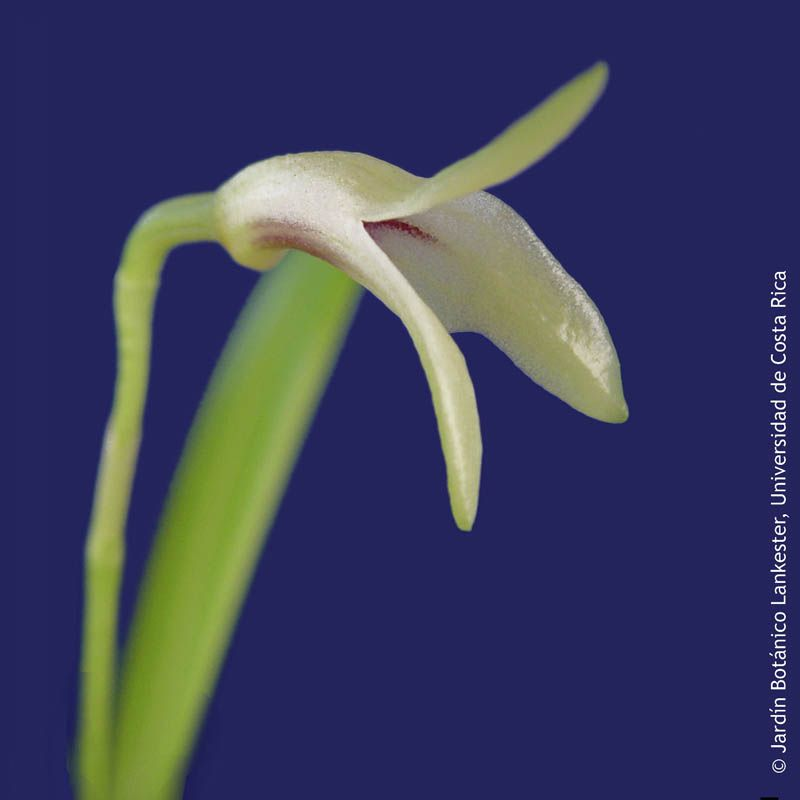 Found in Guatemala, Belize, Honduras, Nicaragua and Costa Rica in premontane rainforests at elevations of 350 to 1200 meters as a mini-miniature sized, hot to warm growing epiphyte with erect, slender ramicauls enveloped basally by 2 to 3 tubular sheaths carrying a single, apical, erect, coriaceous, ellptical, subacute to obtuse leaf that is narrowly cuneate into the petiole blooming on a slender, erect, 2 1/4" to 3 1/2" [6 to 9 cm] long, solitary flowered inflorescence arising from low on the ramicaul with a bract above the base and a tubular floral bract holding the waxy flower at or just above leaf height occuring in the mid-winter.