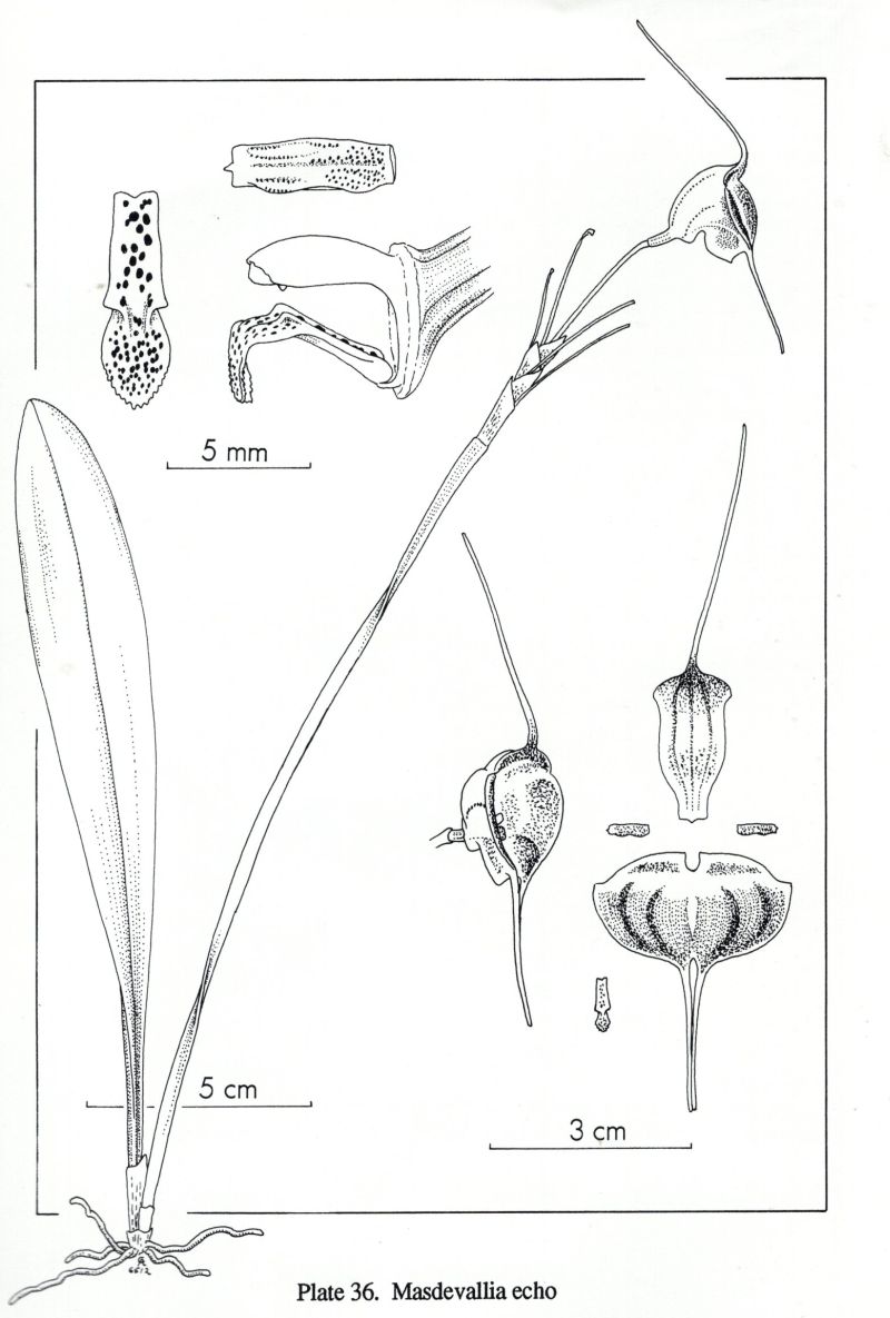 References W3 Tropicos, Kew Monocot list , IPNI ; Systematics of Masdevallia Vol 2 Luer 1986; Icones Planetarum Tropicarum Series II Orchids of Peru Plate 0101 Dodson & Bennett 1989 drawing fide; Icones Orchidacearum Peruviarum Plate 288 Bennett & Christenson 1995; Icones Pleurothallidinarum XIX Systematics of Masdevallia Part 1 Luer 2000 drawing fide; Masdevallia's in Kleur Vol 1 P M Oversteegen, Eisses & A P Sijm 2001 photo fide; Orchid Icones Pleurothallidinarum XXV Systematics of Masdevallia Part Five Luer 2003; Icones Pleurothallidinarum Vol XXVIII Luer 2006 as Alaticaulia echo; Orchid Species of Peru Zelenko Bermudez 2009 photo fide; Mille et Une Mini Orchideees Roguenant 2009 photo fide; Masdevallia in Detail Vol 5 Sijm etal 2010 photo/drawing fide; Orchids Masdevallia with its segregates including Dracula Zelenko 2014 photo fide; AOS Bulletin Vol 85 # 12 2016 photo fide;