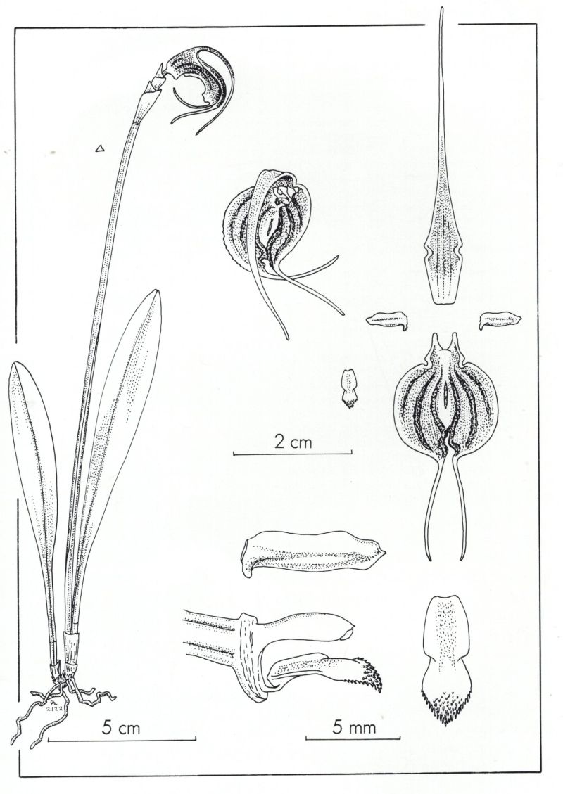 Found in southern Ecuador to central Peru at elevations of 700 to 2000 meters as a miniature sized, warm to cool growing epiphyte with stout, erect, ramicauls enveloped basally by 2 to 3 tubular sheaths and carrying a single, apical, erect, coriaceous, narrowly elliptical, subacute leaf that gradually narrows below into the base and blooms in the spring on an erect, congested, successively few flowered, racemose, triquetrous inforescence arising from low on the ramicaul and with a tubular basal bract and imbricating, thin floral bracts carrying sometimes 2 simultaneous flowers often only one
