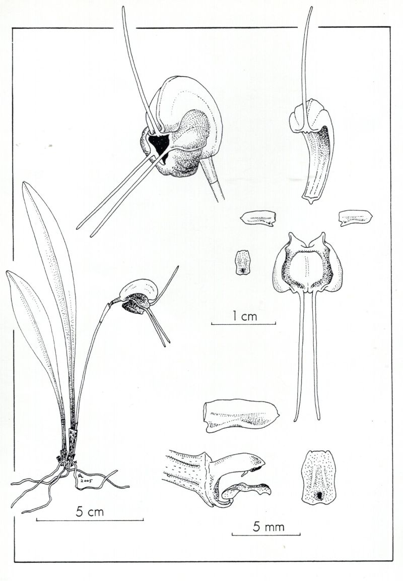 Found in the departments of Santander del Sur and Boyaca departments of Colombia on the eastern cordillera at elevations of 2150 to 2600 meters as a cold growing, miniature to small sized epiphyte with a slender, erect, blackish ramicaul enveloped basally by 2 to 3 tubular sheaths and carrying a single, apical, erect, coriaceous, petiolate, elliptic-obovate, subacute to obtuse leaf that blooms in the spring on an erect, slender, 2 to 3 1/5" [5 to 8 cm] long inflorescence arising from low on the ramicaul with a bract near the base and a tubular floral bract carrying a single flower held at mid-leaf height.