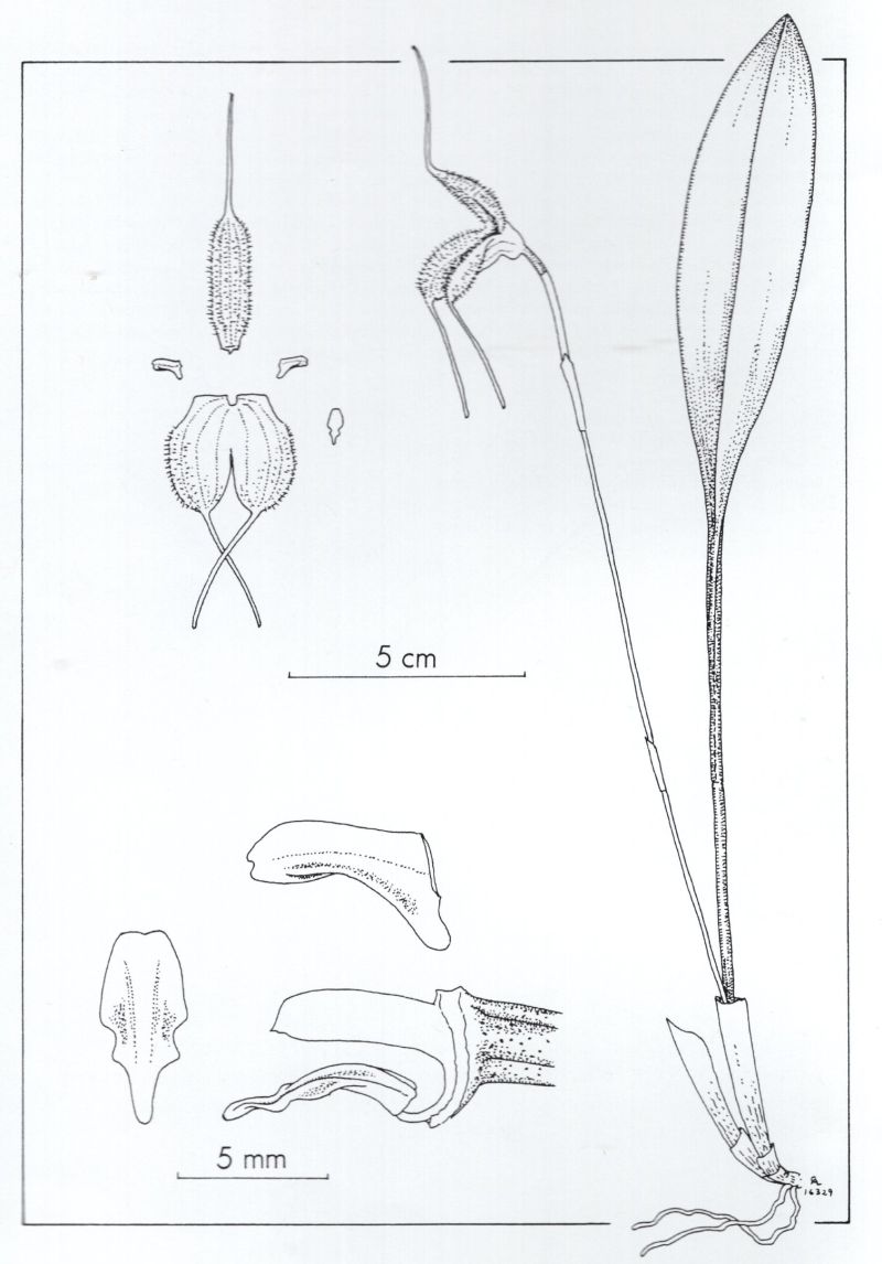 Found in Peru at elevations around 2600 to 3000 meters as a small sized, cold growing epiphyte with slender, erect ramicauls enveloped basally by 2 to 3 loose tubular sheaths and carrying a single, apical, erect, coriaceous, elliptical, subacute, cuneate below into the petiolate base leaf that blooms in the spring on a slender, erect, 4 1/4" to 6.2" [11 to 16 cm] long, single flowered inflorescence arising from above the base of the ramicaul, with a thin bract on the lower third and a tubular floral bract