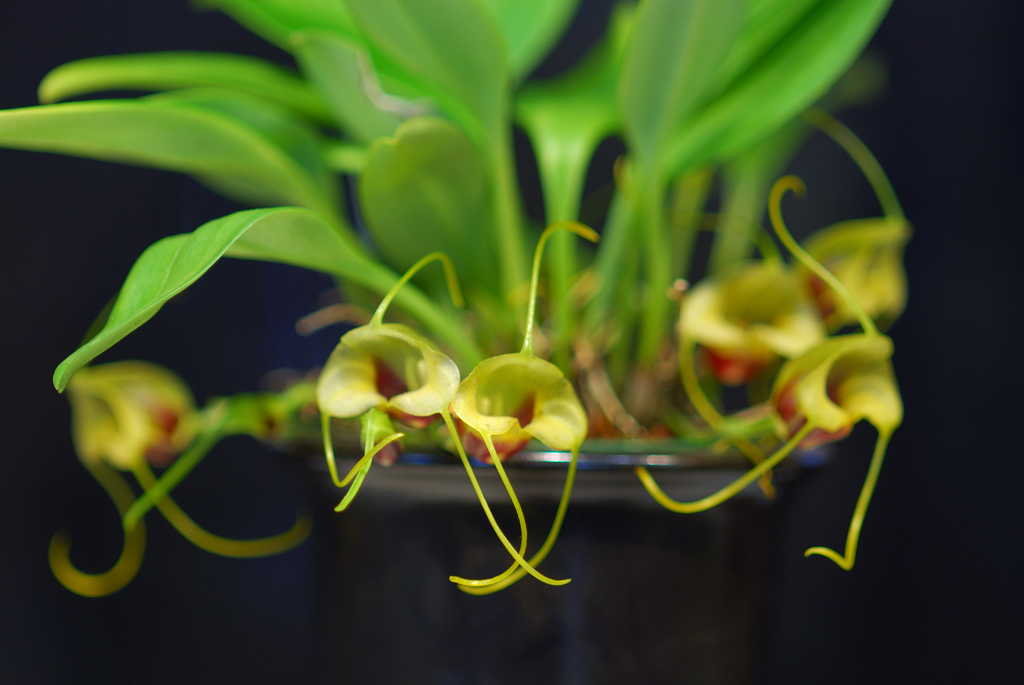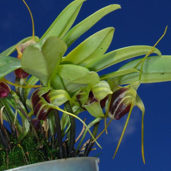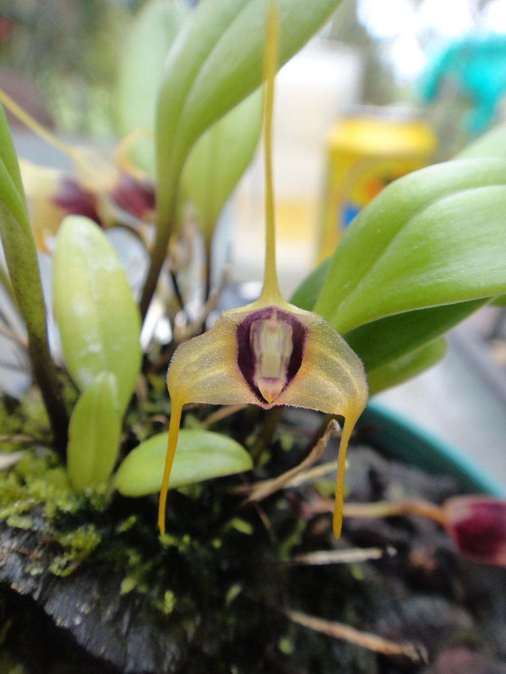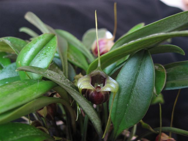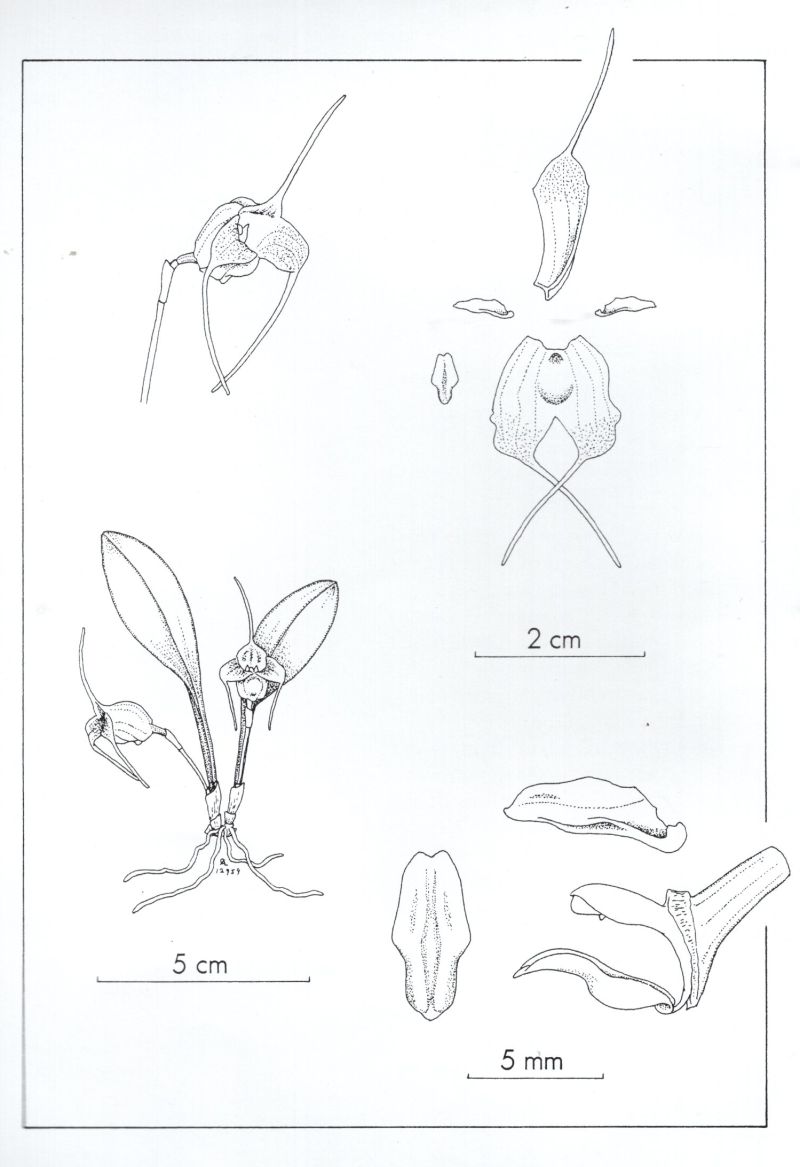 Found in the Cordillera del Condor in Ecuador and Peru at elevations of 1500 to 1650 meters as a mini-miniature sized, cool growing epiphyte with erect, slender, blackish ramicauls enveloped by 2 to 3 loose, tubular sheaths and carrying a single, apical, erect, coriaceous, elliptical, subacute, cuneate belwo in to the petiolate base leaf that blooms in the winter on a slender, erect to suberect, .4 to .7" [1 to 1.8 cm] long, single flowered inflorescence arising from low on the ramicaul with a bract near the base and a tubular floral bract.