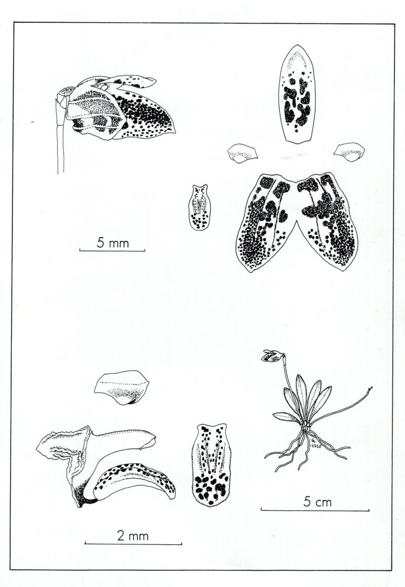 Found in Ecuador at elevations around 950 meters as a mini-miniature sized, warm growing epiphyte with slender, erect, blackish ramicauls enveloped basally by 2 to 3, tubular sheaths and carrying a single, apical, erect, coriaceous, narrowly elliptical, subacute, narrowly cuneate below into the petiolate base leaf that blooms in the winter on a slender, suberect, .8 to 1.4" [2 to 3.5 cm] long, congested, racemose, successively single, few flowered inflorescence arising from low on the ramicaul with a bract near the base and as long as the pedicel floral bracts.