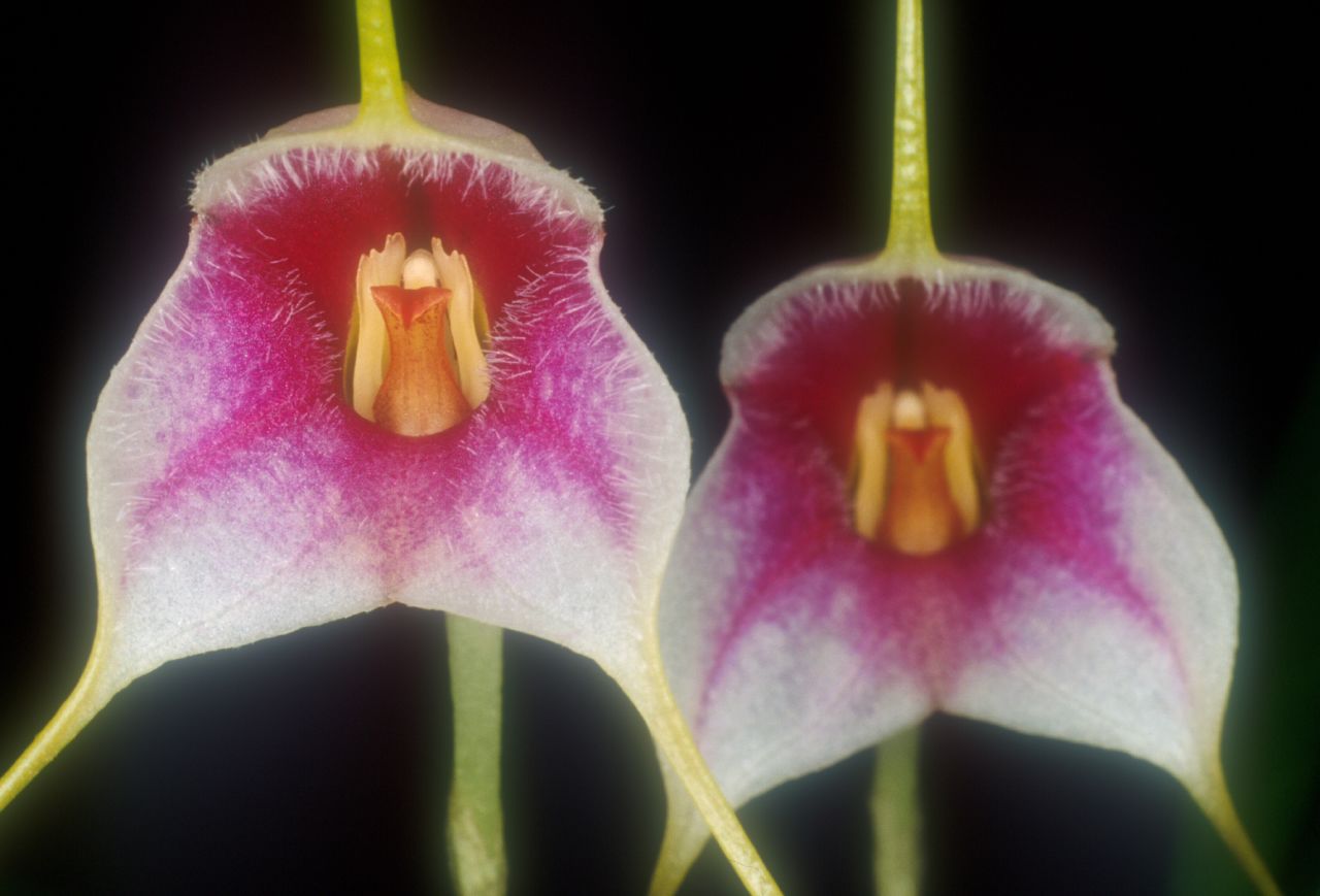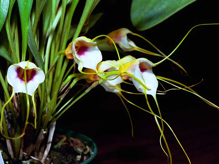 Distinguished from others by it's snow white sepals with a bright crimson suffusion on the middle 1/3 to 1/2 and orange towards the base, the sepals are sparsely long-pubescent above the middle, the sepaline tails are long and slender and the deflexed acute lip has a black tip.