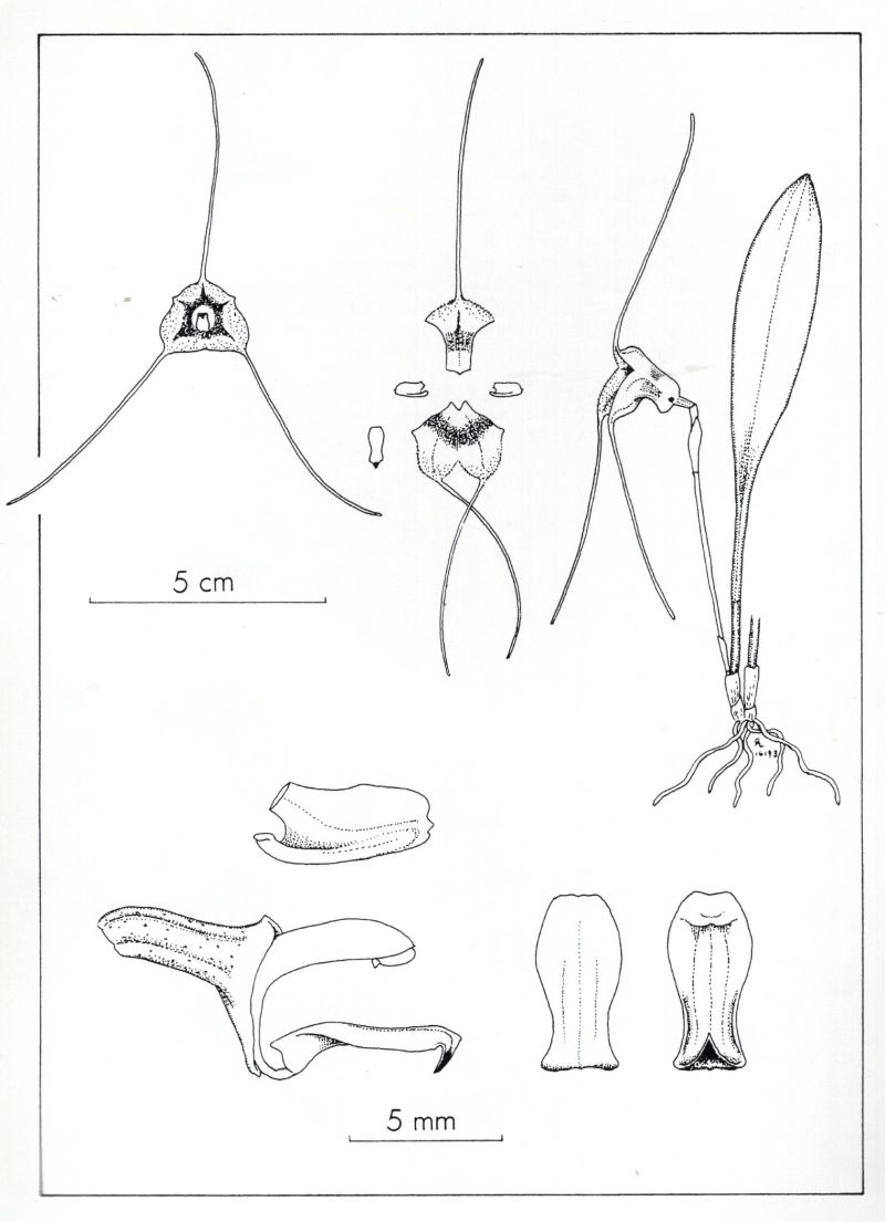 Found in Peru and Bolivia in wet montane forests at elevations of 1800 to 2000 meters as a mini-miniature sized, cool growing species with slender, erect, blackish ramicauls enveloped by 2 to 3, loose, tubular sheaths carrying a single, apical, erect, coriaceous, elliptical, subacute leaf that is narrowly cuneate below into the petiole and blooms in the summer on slender, erect, 2 2/5" [6 cm] long inflorescence arising from low on the ramicaul with a thin bract near the base and a tubular floral bract that holds its solitary flower at or just below leaf height.