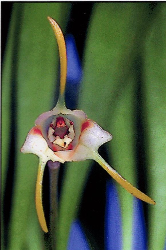 Closely related to M attenuata and M laucheana but differs in the loose raceme of successive small, yellowy flowers with a sepaline tube constricted above a mentum formed with the column foot and the orange, clavate sepaline tails.